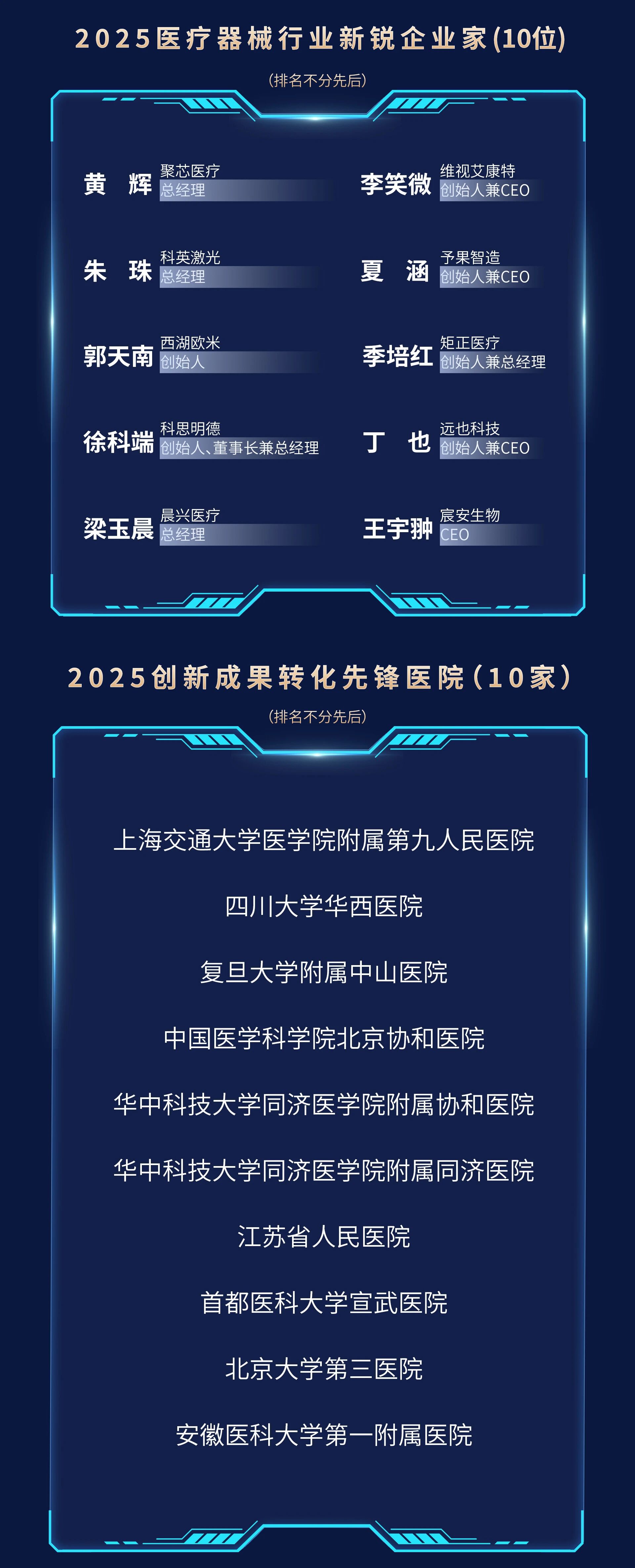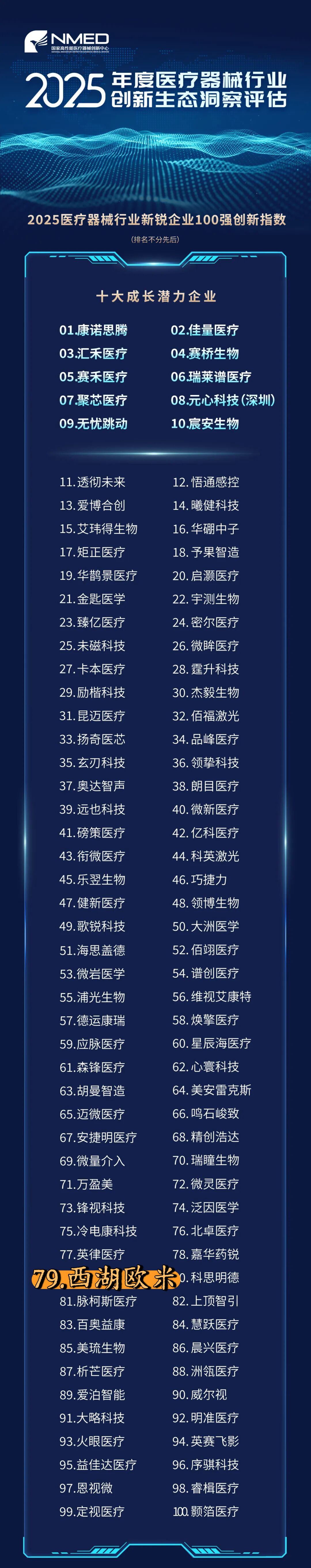 在此次评选中,西湖欧米入选“2025医疗器械行业新锐企业100强”,其创始人郭天南教授亦荣登“2025医疗器械行业新锐企业家”榜单。