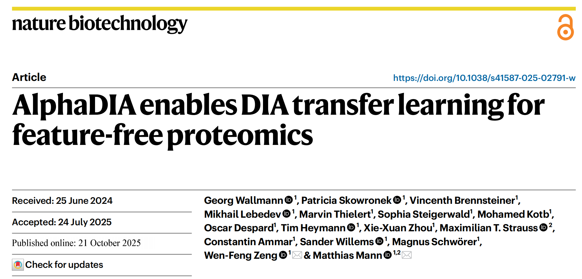 2025年10月21日,针对DIA分析的“老大难”,Matthias Mann团队在《Nature Biotechnology》发表了题为“AlphaDIA enables DIA transfer learning for feature-free proteomics”的文章,推出开源的AlphaDIA的搜库软件,用“无特征处理 + 深度学习迁移学习”的方式搬平DIA数据解析的三座大山。