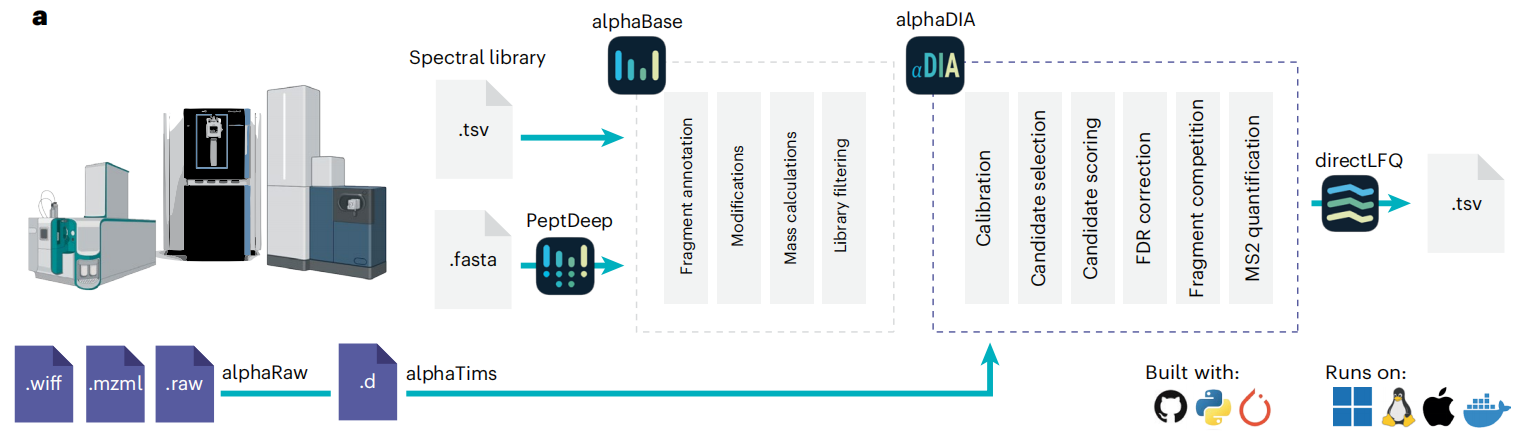 AlphaDIA是一款用于DIA搜索的模块化开源框架。该框架基于科学Python工具栈和 alphaPept生态系统构建,支持灵活的搜索策略,可通过Python API、Jupyter notebooks、命令行界面或易于安装的图形用户界面访问。AlphaDIA涵盖了从原始文件到蛋白定量报告的完整工作流程,能够处理所有主流厂商的文件及专有格式。其设计初衷是实现大型队列的“一站式处理”,可在Windows、Linux和Mac系统上原生运行,也能通过Slurm 或Docker以分布式方式在云端部署。
