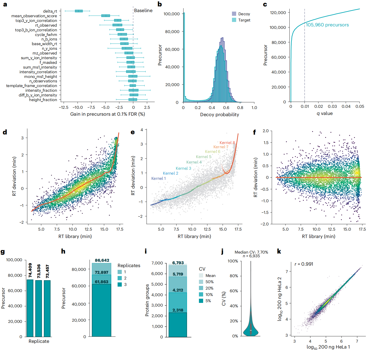 具体而言,每个峰组由一个含多达47个特征的全连接神经网络(NN)进行评分(图2a)。利用神经网络预测的概率计算基于计数的假发现率(FDR),以此控制前体的假阳性鉴定(图2b、c)。对于保留时间、离子迁移率和质荷比等实测属性,会在高置信度前体子集上,通过带有多项式基函数的非线性局部加权散点平滑(LOESS)回归,迭代校准至观测数据(图2d-f)。