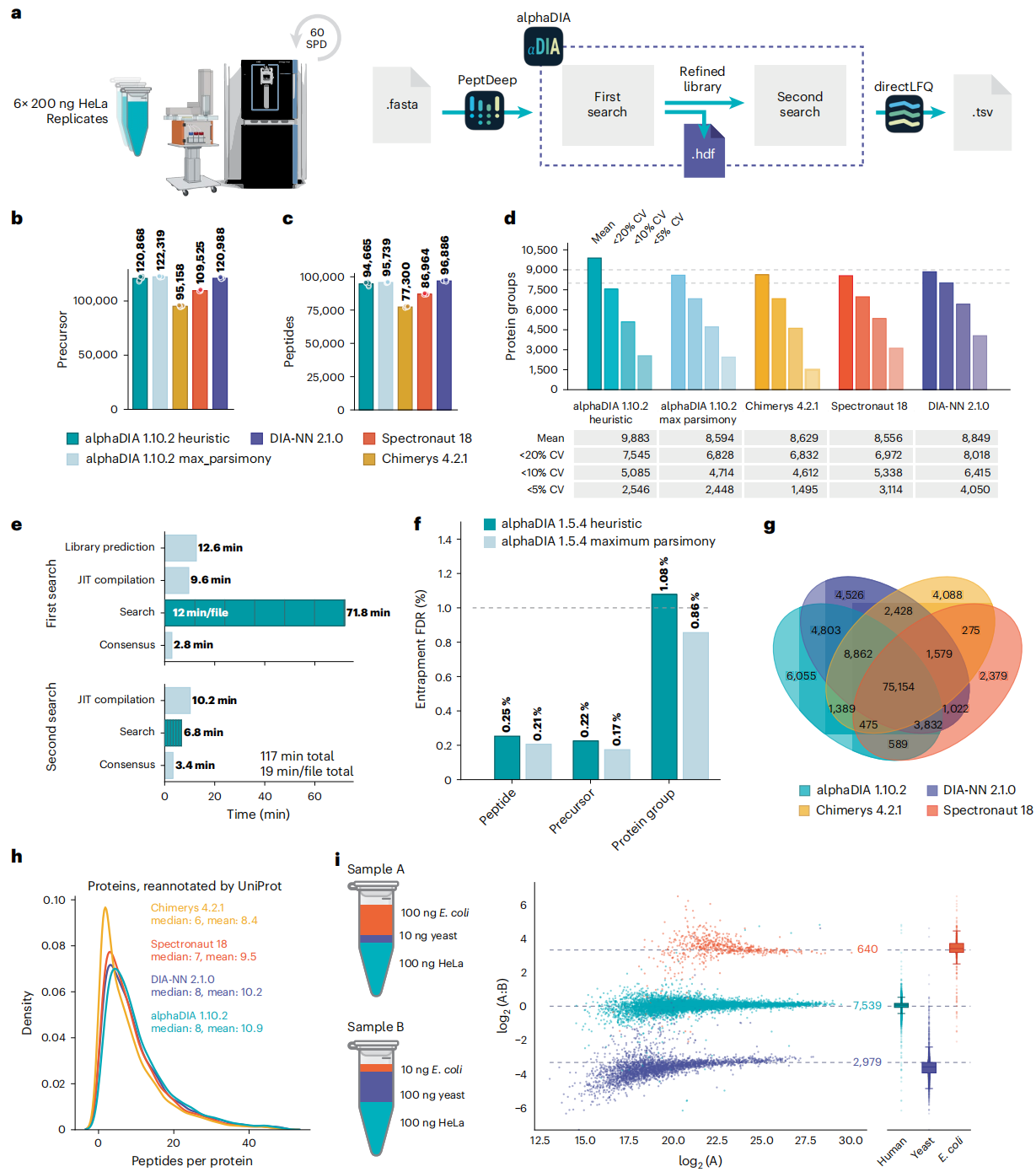 借助预测谱库,AlphaDIA包含谱库优化与定量两步搜索流程(图5a)。为进行基准测试,作者采集了大量HeLa样本,并使用包含360万个胰蛋白酶解前体的AlphaPeptDeep预测谱库进行搜索。结果显示,AlphaDIA平均可鉴定出超过120,000个前体,性能与其他测试搜索引擎相当甚至更优(图5b)。值得注意的是,在60-SPD方法(21分钟)下,采用启发式分组可鉴定出9,800个蛋白组,未分组时可鉴定出近8,600个蛋白(图5d)。通过添加拟南芥谱库,验证了两步流程的FDR控制效果(图5f)。在不同搜索引擎的比较方面,AlphaDIA鉴定的独特肽段数量最多,这体现为更高的序列覆盖率(图5g-h)。在定量准确性方面,全预测谱库搜索结合directLFQ算法,能以出色的精度与准确性重现预期比例(图5i)。