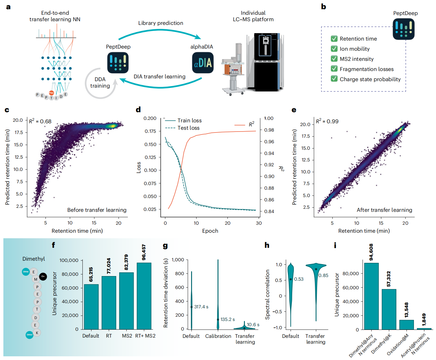 具体而言,作者将深度学习预测与搜索引擎紧密整合,让模型自主适配这些差异——作者将这种方法称为“DIA迁移学习”。首先通过可靠鉴定得到前体及其谱图,并将其收集为训练数据集;随后,在该实验特异性训练数据集上,对保留时间、碎裂图谱与电荷的通用预训练模型进行微调(图6a、b),最终得到的定制模型。为评估迁移学习的潜力,作者首先将其应用于二甲基化HeLa肽段数据集(图6c)。结果显示,迁移学习将RT预测R²从0.69提升至0.99、RT误差中位数从317s降到11s、谱图相关中位数从0.5升到0.85;最终前体数从65k提升到96k(+48%)、蛋白到8,613(+25%)(图6d-i)。