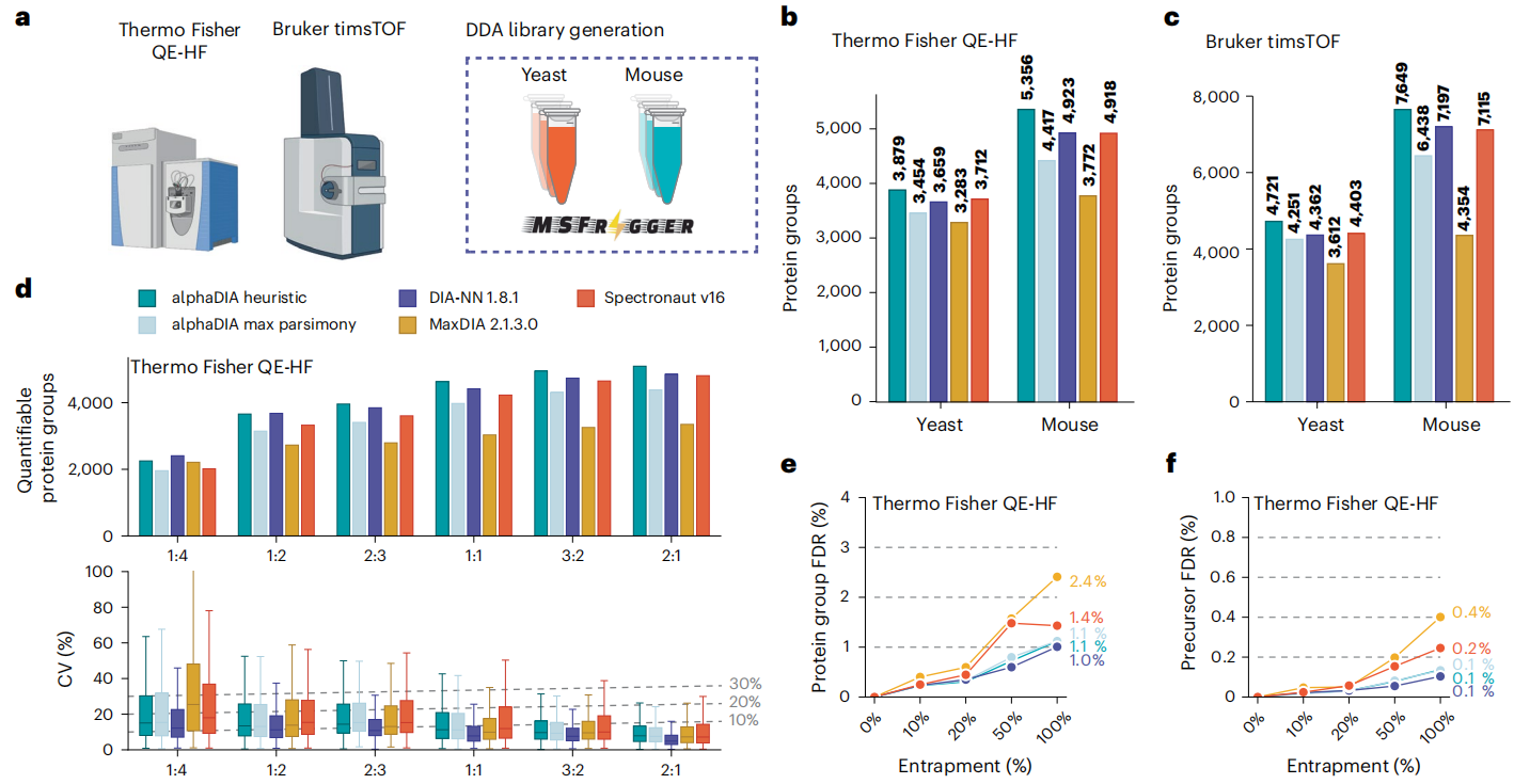 在小鼠脑膜蛋白+酵母复杂背景基准数据上(QE-HF与timsTOF),AlphaDIA鉴定的蛋白组数量与DIA-NN、Spectronaut、MaxDIA相比,AlphaDIA鉴定的蛋白组数量持平或更优,蛋白质鉴定准确性和蛋白质定量CV均相当。(图4a–d)。采用拟南芥谱库做外部校准,即使拟南芥谱库占比达到100%也能在设定FDR下维持严格的蛋白/前体层面假阳性率(图4e–f)。