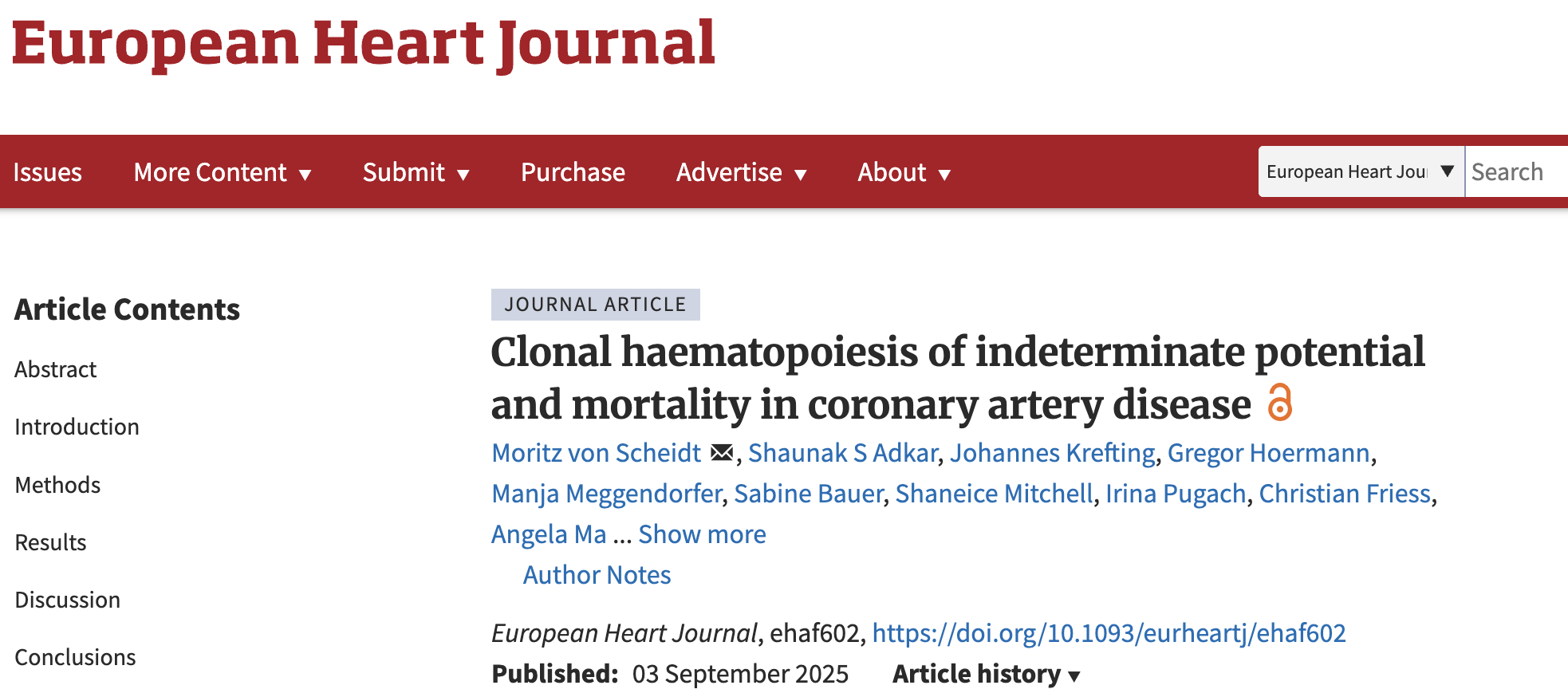 2025年9月3日,European Heart Journal发表了一项由慕尼黑工业大学德国心脏中心等机构合作完成的研究。该研究深入探讨了不确定潜力的克隆性造血(CHIP)与冠状动脉疾病(CAD)患者死亡率之间的关联。研究团队对8612名CAD患者进行了基因测序,发现CHIP携带者在3年内的全因死亡率显著增加。