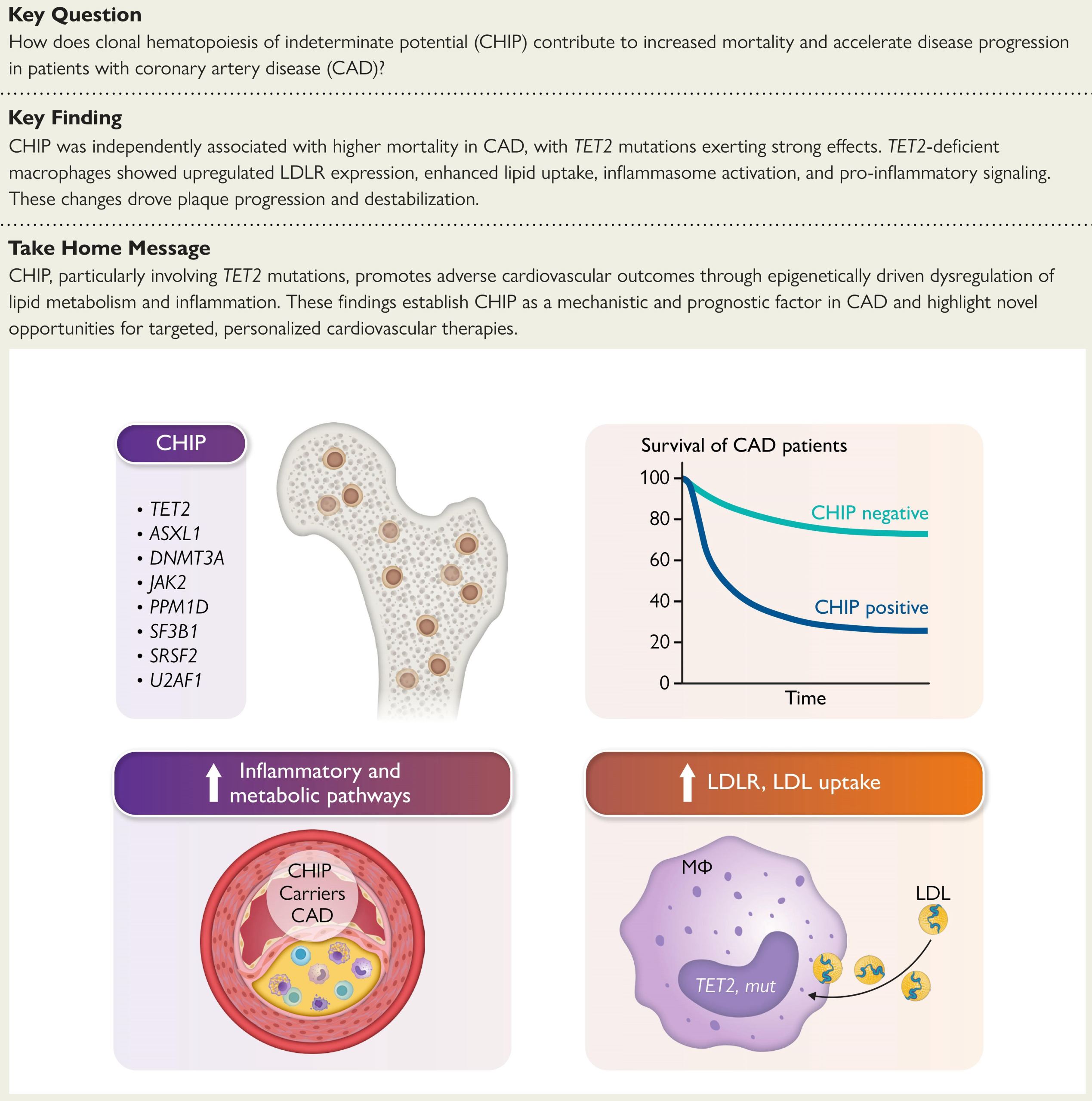 通过高灵敏度蛋白质组学等多组学技术,研究揭示了CHIP的潜在机制。特别是TET2突变,它通过上调脂质代谢和炎症通路,使巨噬细胞对脂质的摄取增加,导致斑块坏死核心增大,稳定性降低。这项研究首次将CHIP确定为CAD患者死亡率的独立预测因子,并从分子层面阐明了其促动脉粥样硬化的作用机制,为CHIP相关心血管风险的早期筛查和干预提供了重要依据。