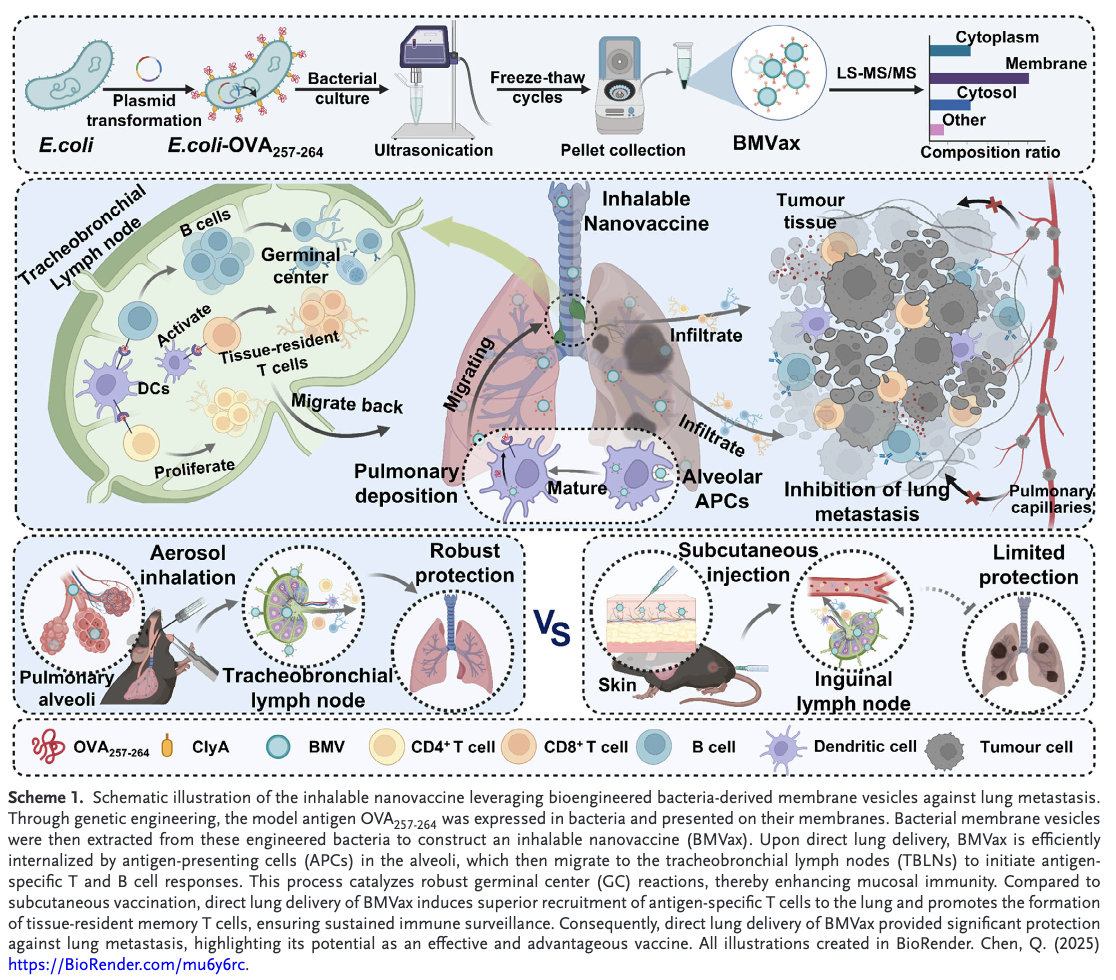 2025年9月4日,Advanced Materials发表了一项由苏州大学功能纳米与软物质研究院等机构合作完成的研究。为了解决肺转移的治疗难题,研究团队开发了一种名为BMVax的吸入式纳米疫苗,该疫苗利用工程大肠杆菌产生的细菌膜囊泡,并通过蛋白质组学技术鉴定了关键的免疫刺激蛋白。