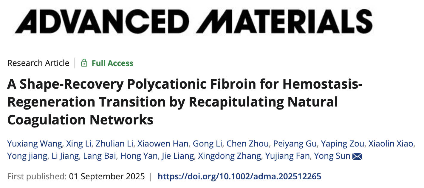 2025年9月1日,Advanced Materials发表了一项由四川大学国家生物材料工程技术研究中心等机构合作完成的研究。该研究受天然凝血网络中纤维蛋白(Fn)形成机制的启发,设计了一种人工聚阳离子纤维蛋白(pCSF/beta),能够实现快速止血并同步促进组织再生。