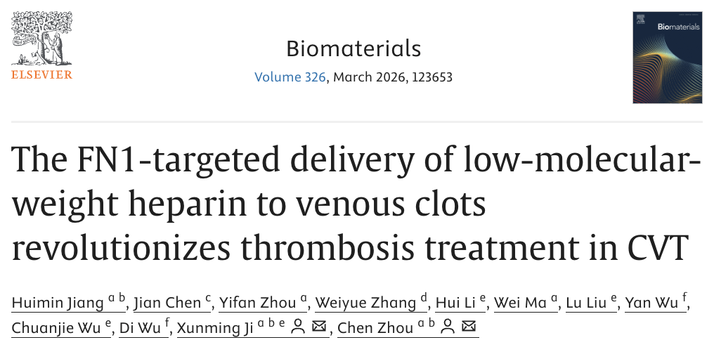 2025年8月28日,Biomaterials发表了一项由首都医科大学北京脑疾病研究所等机构合作完成的研究。该研究采用蛋白质组学技术,鉴定出纤维连接蛋白(FN1)作为脑静脉血栓形成(CVT)患者血栓中特异性高表达的靶点。