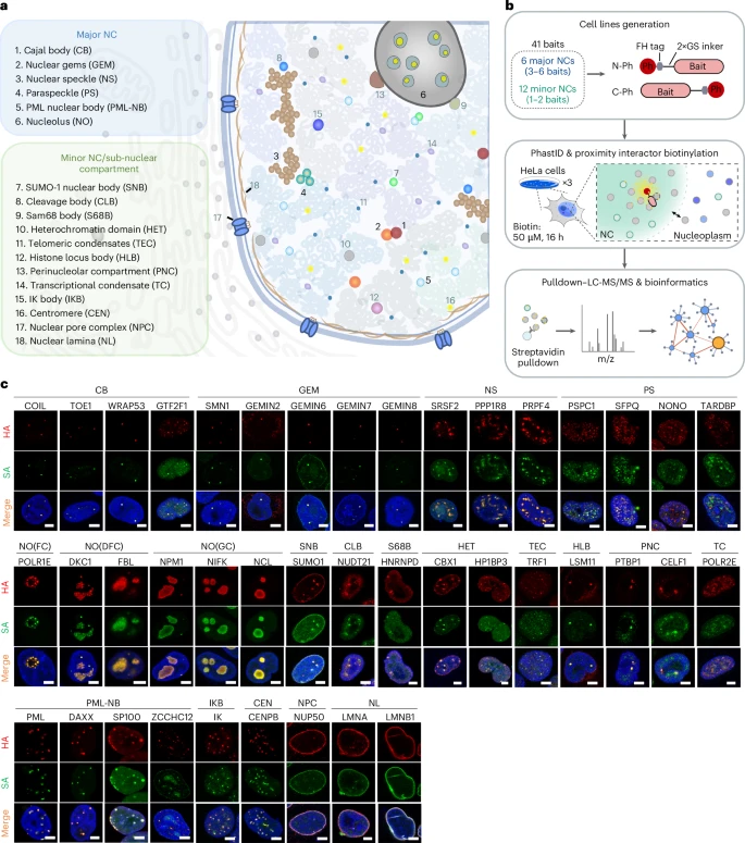 2025年11月28日,来自中山大学生命科学学院、深圳华大基因研究院等机构的研究团队发表了一项关于人类核凝聚体近端蛋白质组学景观的重要研究。核凝聚体(Nuclear condensates, NCs)是无膜细胞器,能够实现细胞核内的空间和功能区隔化。然而,NCs的组成和功能共组织尚未得到充分研究。本文使用PhastID探索了HeLa细胞中18个NCs的近端互作组。文章的数据揭示了这些NCs之间基因控制的组织流动。至关重要的是,他们开发了一种算法来剖析NCs内部关系的复杂性。该算法带来了多项关键发现:不仅鉴定出一个未被表征的BUD13核凝聚体,还揭示了核宝石(Cajal body)与剪接斑点(Nuclear speckle)在端粒酶RNA成熟过程中的特异性共组织,以及核宝石与组蛋白位点体(Histone locus body)在组蛋白mRNA前体加工中的特异性共组织。研究团队还创建了一个全局参考图谱,以理解应激下的NC动态以及疾病相关突变如何不同地影响NC互作组。总体而言,该工作提供了一个人类NCs的近端蛋白质组学图谱,显著提升了对核内生物学过程的时空理解。