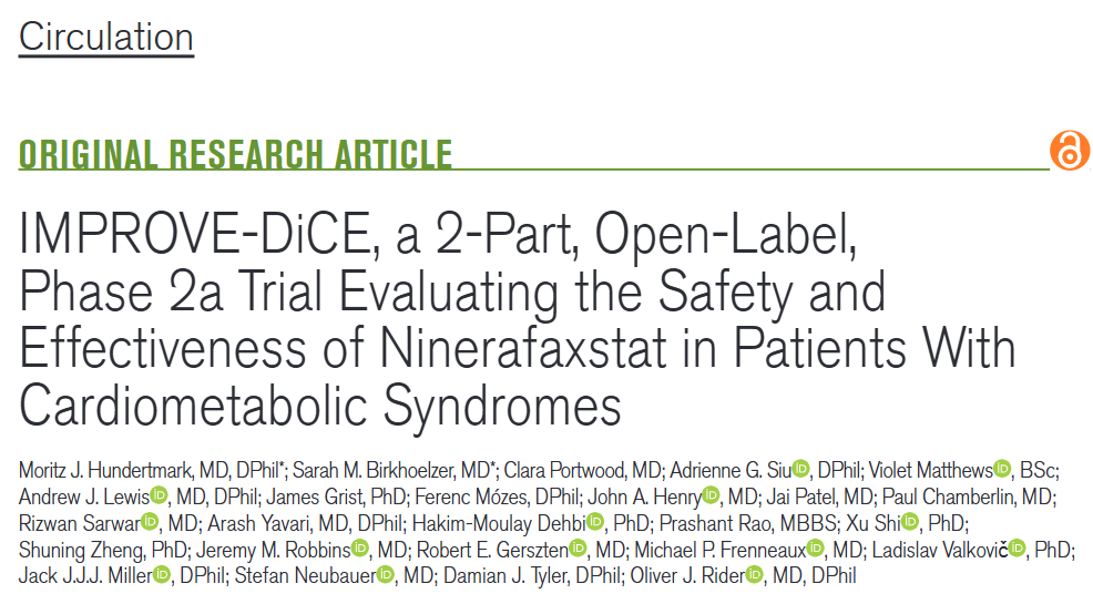 2.  (Circulation, IF:35.5) IMPROVE-DiCE:Ninerafaxstat在心脏代谢综合征中的2a期试验