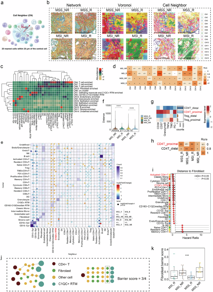 Figure 3 结直肠癌患者MSS/MSI_R和NR的空间细胞邻近关系及细胞间距离表型分析