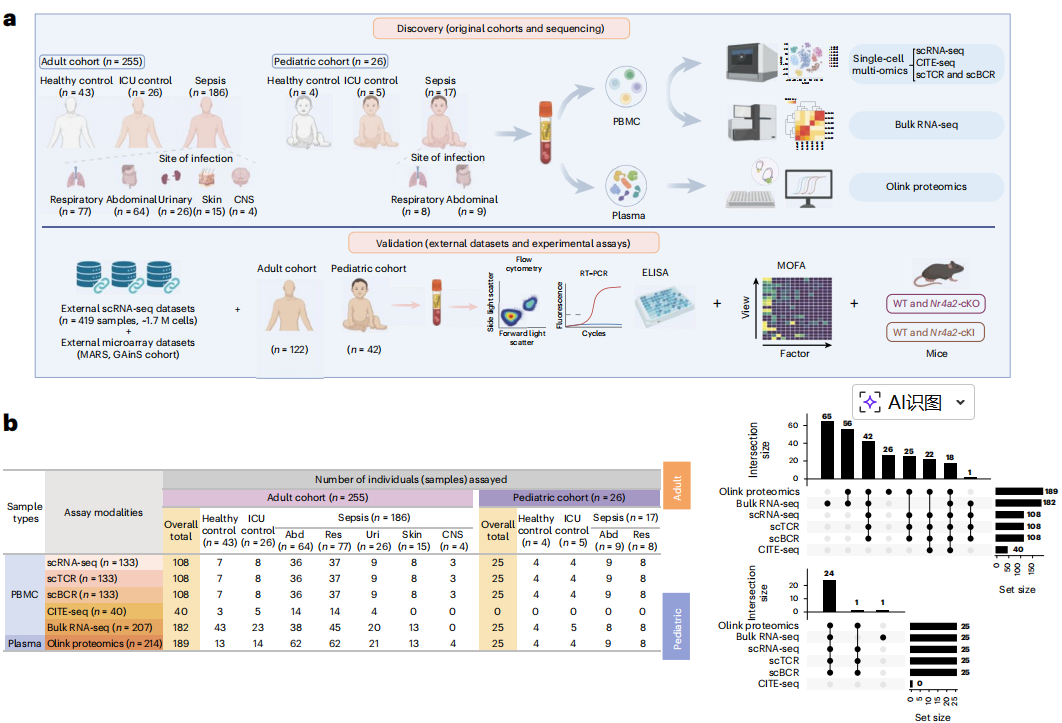 本研究纳入队列包括255名成人和26名儿童(脓毒症患者及对照),采集外周血单核细胞(PBMCs)和血浆开展多组学检测分析。