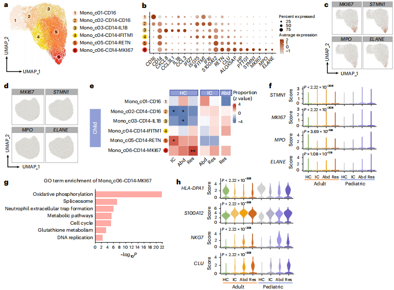 通过单细胞转录组数据,以及单细胞T细胞受体(scTCR)和单细胞B细胞受体(scBCR)谱分析,鉴定出44个细胞亚群(Fig.2c),包括T细胞(CD4⁺、CD8⁺)、B细胞、髓系细胞、NK细胞等。通过对细胞类型比例进行定量分析(Fig.2d, 2e)显示成人脓毒症中CD8⁺T细胞和NK细胞减少,儿童肺部脓毒症中CD4⁺T细胞比例降低。