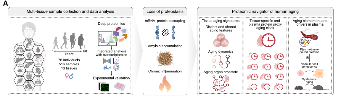 本研究通过构建一个包含13种人体组织、覆盖50年生命周期的跨学科蛋白质组图谱,为理解衰老的多层次机制提供了新的视角。通过对这些组织的系统性分析,研究不仅揭示了衰老过程中的蛋白质稳态失衡,还阐明了不同器官在衰老过程中的特异性变化,并揭示了衰老过程中器官间复杂的通讯机制。