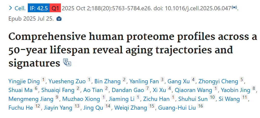 为了弥补这一空缺,中国科学院动物研究所刘光慧研究员、国家生物信息中心张维绮研究员、中国科学院动物研究所曲静研究员与四川大学华西医院杨家印教授合作团队于2025年10月2日在《Cell》发表题为《Comprehensive human proteome profiles across a 50-year lifespan reveal aging trajectories and signatures》的最新研究。
