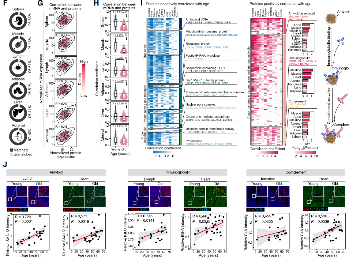 进一步分析发现,衰老组织中蛋白质合成相关蛋白(如核糖体蛋白、氨酰-tRNA合成酶)普遍下调,而蛋白质折叠、组装和转运相关蛋白(如TCP1、CCT5、CCT7、PSMB1)也显著减少(Fig 1I)。与此同时,淀粉样蛋白(如SAA1、SAA2)和免疫球蛋白(如IGLC、IGHA)在多个组织中积累,形成“淀粉样-免疫球蛋白-补体”轴,加剧组织炎症与衰老微环境 (Fig 1J)。