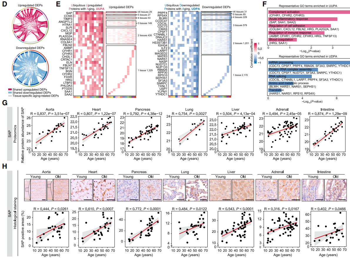 研究系统鉴定了所有组织中的衰老差异表达蛋白(DEPs)。尽管多数DEPs具有组织特异性,但约40%的DEPs在至少两种组织中共享变化趋势(Fig 2D)。其中,29个在超过6种组织中一致上调的蛋白被定义为“泛上调衰老蛋白”,包括最显著的血清淀粉样P成分(SAP);31个一致下调的蛋白被定义为“泛下调衰老蛋白” (Fig 2E)。功能上,前者富集于补体激活与炎症,后者则与RNA剪接等基础功能相关 (Fig 2F)。组织学验证了SAP在多种衰老组织中的累积 (Fig 2G, 2H)。