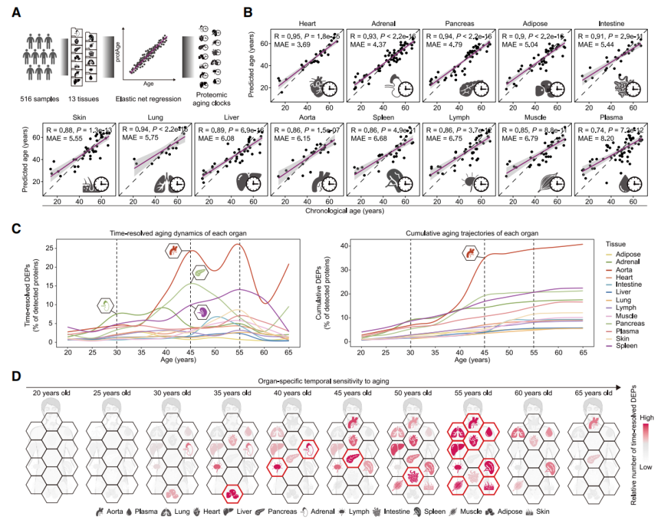 基于这些蛋白,研究构建了“血浆代理组织衰老时钟”,仅通过血浆蛋白即可预测各组织年龄,为非侵入性衰老评估提供了新工具。