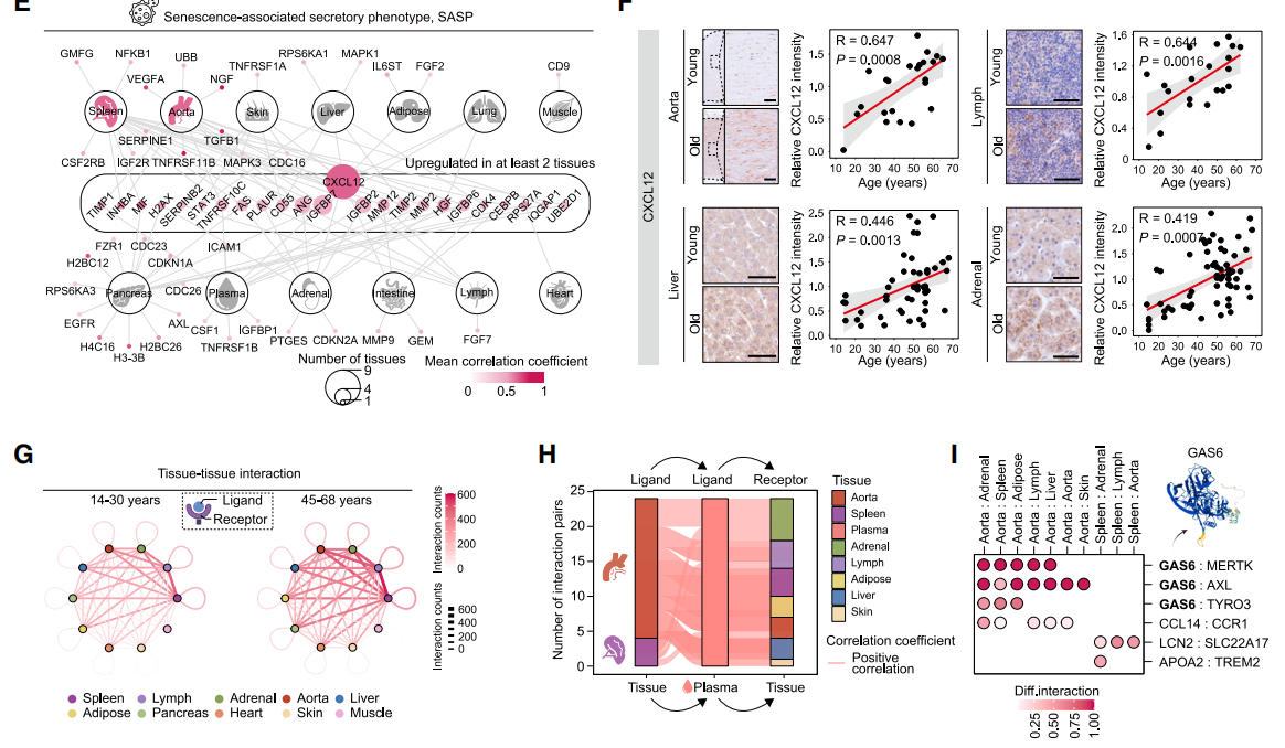 研究鉴定了1,140种年龄相关的分泌蛋白,并构建了组织特异性衰老相关分泌表型图谱。其中,趋化因子CXCL12在9种组织中随年龄上升 (Fig 4E–4F),GAS6在主动脉和血浆中显著升高,并通过TAM受体(TYRO3/AXL/MERTK)促进内皮细胞衰老和系统性衰老 (Fig 4I)。