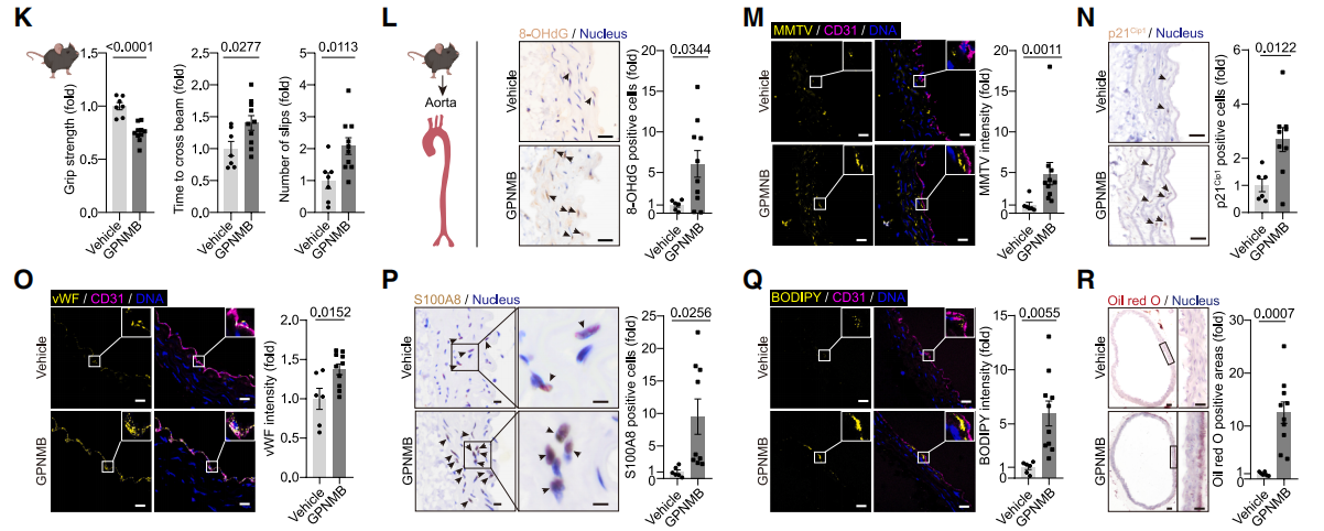 研究进一步验证了7种血浆来源的衰老相关蛋白(GPNMB、COMP、HTRA1、SLPI、IGFBP7、NEGR1、NOTCH3)可诱导内皮细胞衰老。其中GPNMB在小鼠模型中可加速血管老化、运动功能下降与多器官退化(Fig 7K-7R),提示这些“衰老蛋白”不仅是衰老的标志,更是系统性衰老的驱动因子。