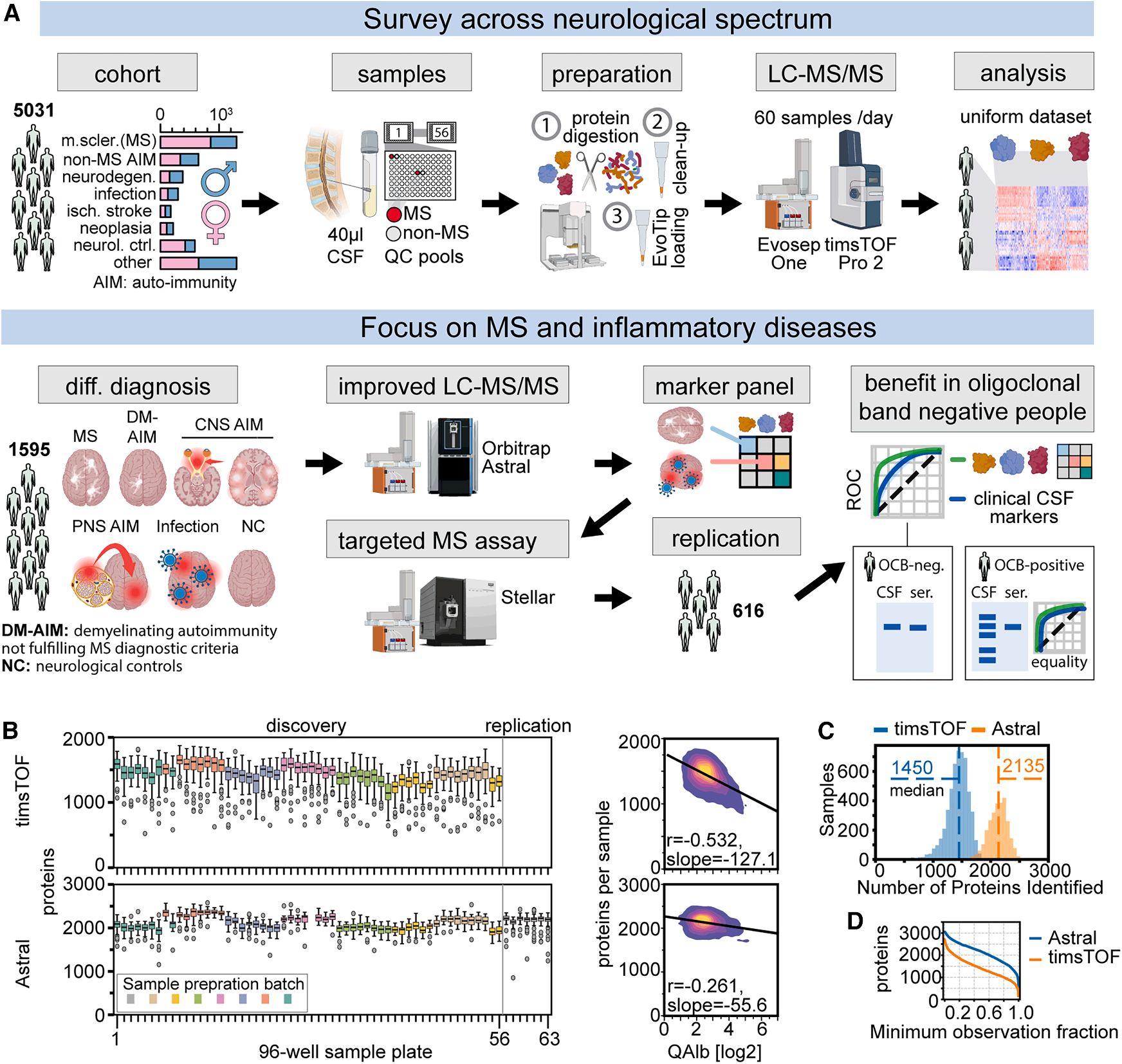 为构建并验证用于多发性硬化症(MS)诊断的蛋白质组学生物标志物模型,从总队列中,按年龄、性别及OCB状态等关键协变量进行分层,选取了包含MS、其他炎症性疾病及对照组的1600份样本,并使用高分辨质谱(Orbitrap Astral)进行了深度蛋白质组学分析(Fig. 5A),确保了数据的质量与覆盖度(>2000种蛋白)。
