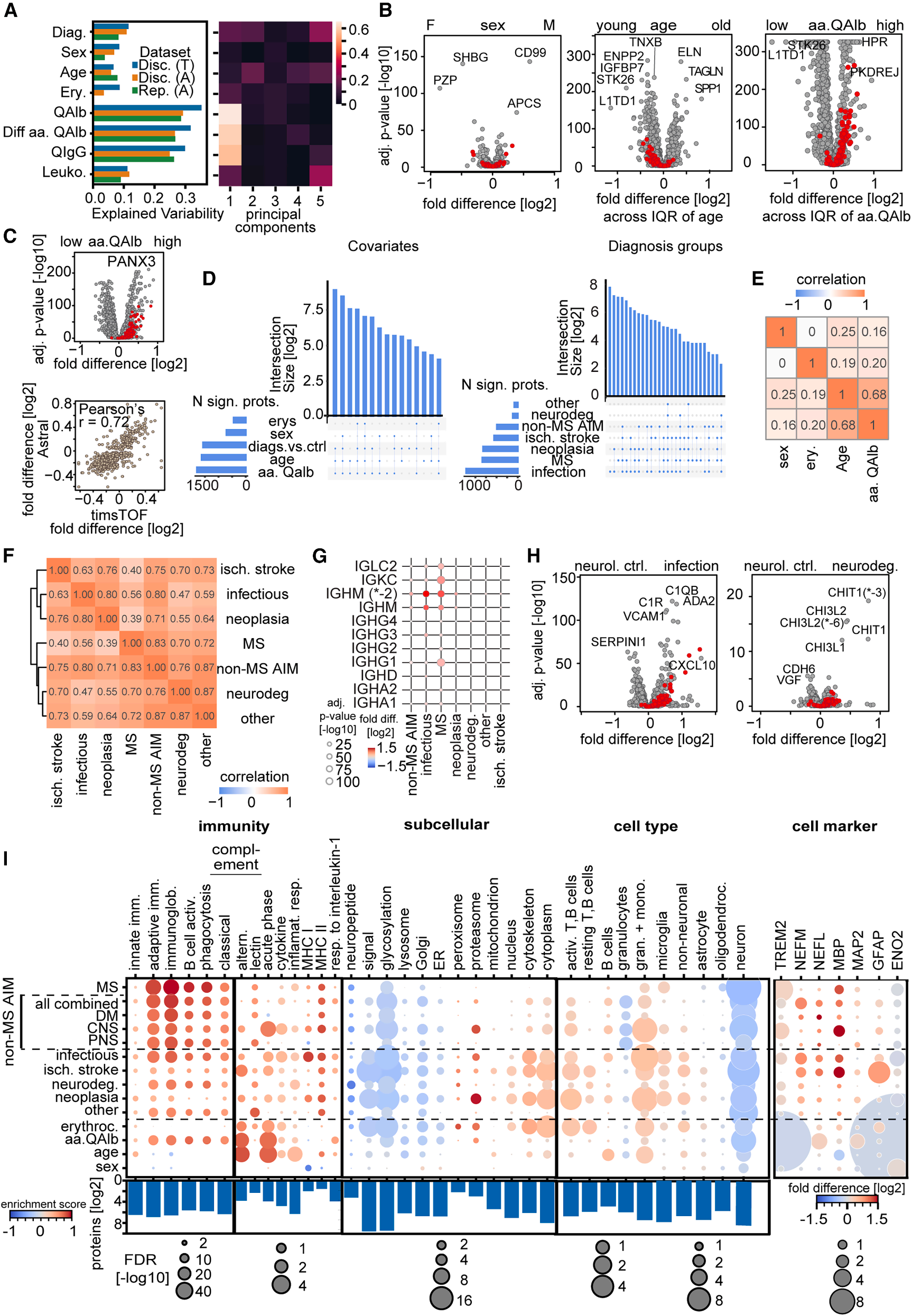 分析显示,BCB损伤(通过白蛋白比率QAlb衡量)是CSF蛋白质组最大的变异来源,其解释的变异量是临床诊断或其他协变量(如年龄、性别)的三倍。由于BCB损伤会导致大量血浆蛋白渗入CSF,若不校正,会掩盖真正的疾病信号。研究证明,在差异表达分析中必须将QAlb作为线性回归的协变量进行校正。同时研究发现血浆蛋白ITIH1或C5的CSF丰度与BCB损伤高度相关,可作为QAlb的替代指标,用于缺乏QAlb数据的研究。年龄、性别和CSF白细胞计数等协变量也解释了显著的蛋白质组变异,并调节了数百至数千种蛋白质。这些协变量的效应大多彼此独立,且与特定疾病的相互作用很小,因此在多变量模型中纳入这些协变量进行校正是有效的(Fig. 2)。