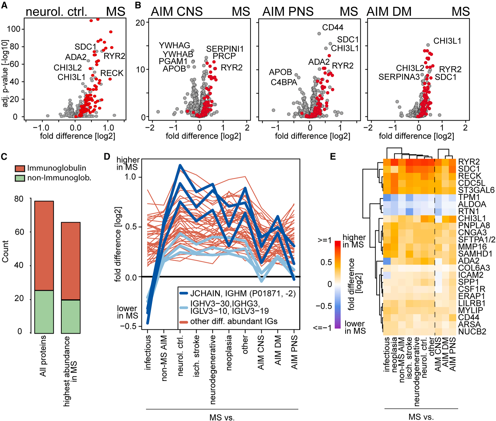 通过对多发性硬化症(MS)、神经系统对照组以及其他自身免疫性疾病患者的脑脊液蛋白质组进行对比分析,研究人员发现在MS与所有其他神经系统疾病对比中,共有约77种蛋白质存在显著差异,其中约四分之三为免疫球蛋白,且以IgG亚型为主(Fig. 3C)。这凸显了B细胞及体液免疫在MS病理中的核心作用。相比之下,IgM蛋白则在感染性疾病中呈现更高的丰度。此外,约20种非免疫球蛋白蛋白质也与MS显著相关(Fig. 3E)。其中包括RYR2、CSF1R、CTSW等具有潜在治疗价值的蛋白质,以及参与髓鞘脂质代谢的ARSA和细胞外基质重塑相关蛋白RECK。这些分子为了解MS的发病机制提供了新的线索。同时上述蛋白质组的改变在使用蛋白质组学技术进行的对比分析中得到了验证,两种技术检测到的重叠且显著变化的蛋白质,其表达变化趋势高度一致,证实了结果的可靠性。