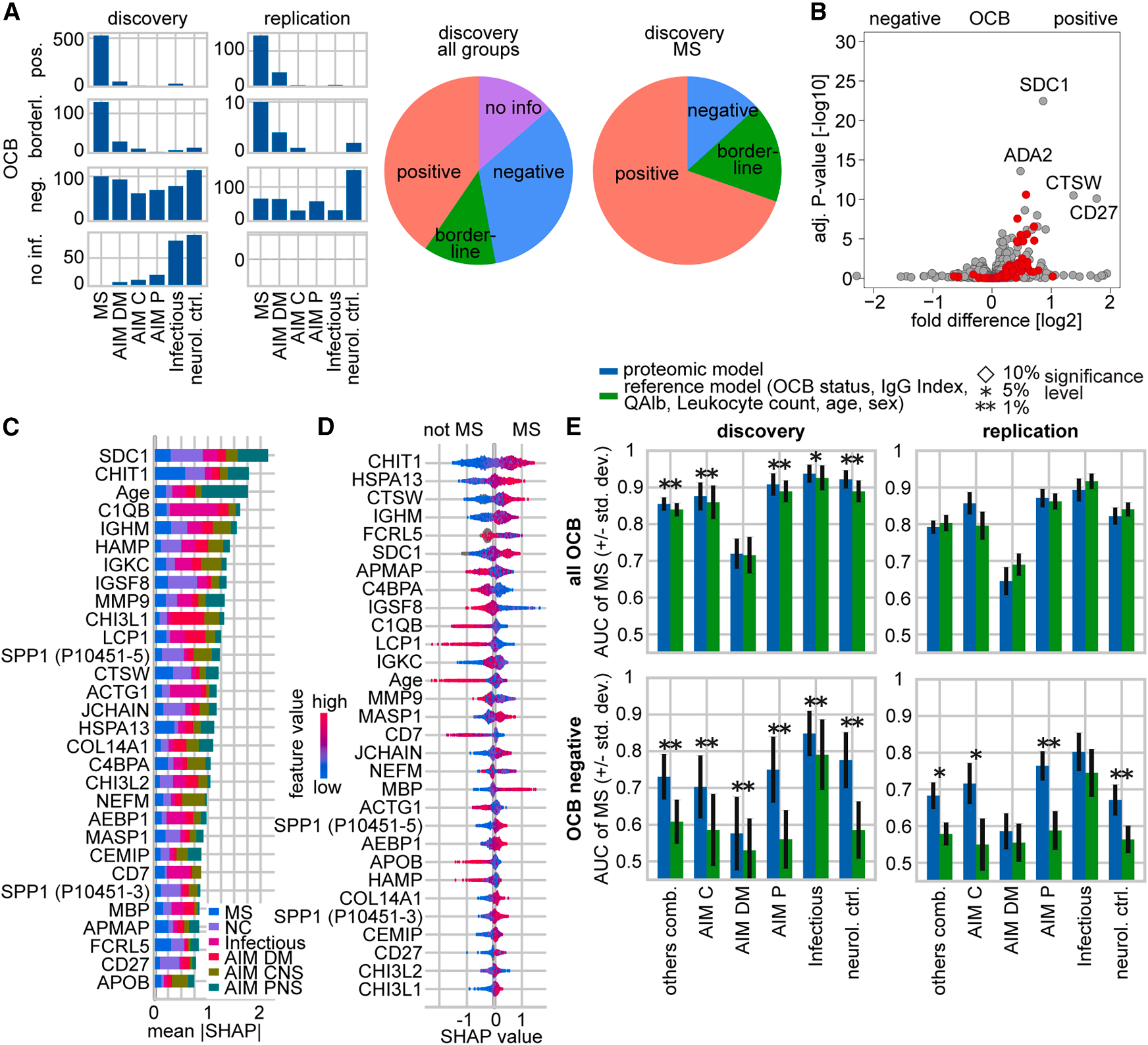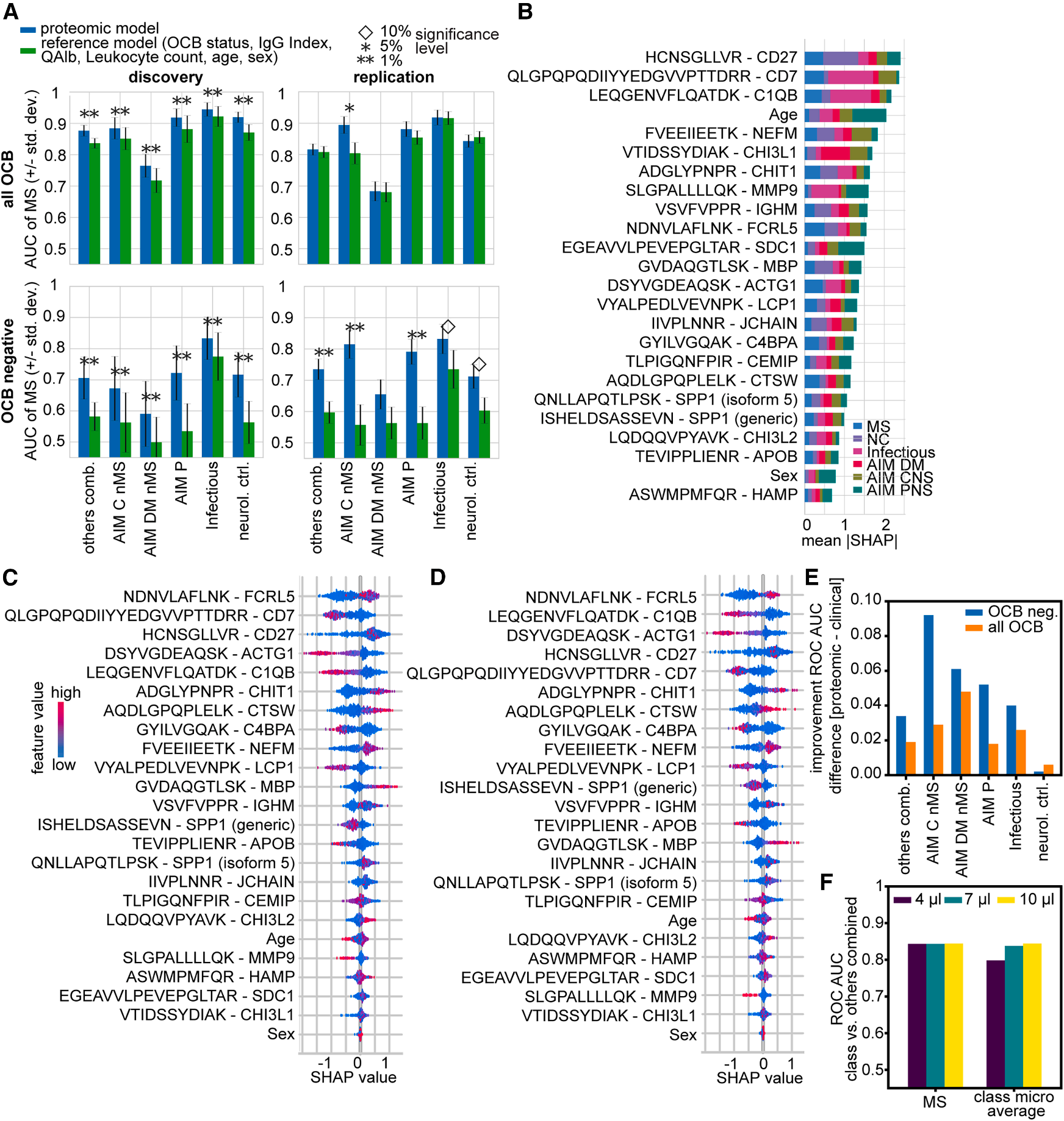 以所有量化蛋白及年龄、性别为特征,通过机器学习筛选出一个包含30个特征(主要为蛋白质)的诊断模型。在所有样本中,该蛋白质组学模型的诊断性能与现有临床标志物组合(包括OCB状态、IgG比率、白蛋白比率等)相当(Fig. 5C-E)。在该临床诊断的难点人群里,该模型用于区分MS与中枢神经系统/周围神经系统自身免疫性疾病的效能显著优于临床参考模型,AUC值提升约0.1-0.2。这一优势在一个包含600份样本的独立验证队列中得到了确认(Fig. 5E)。