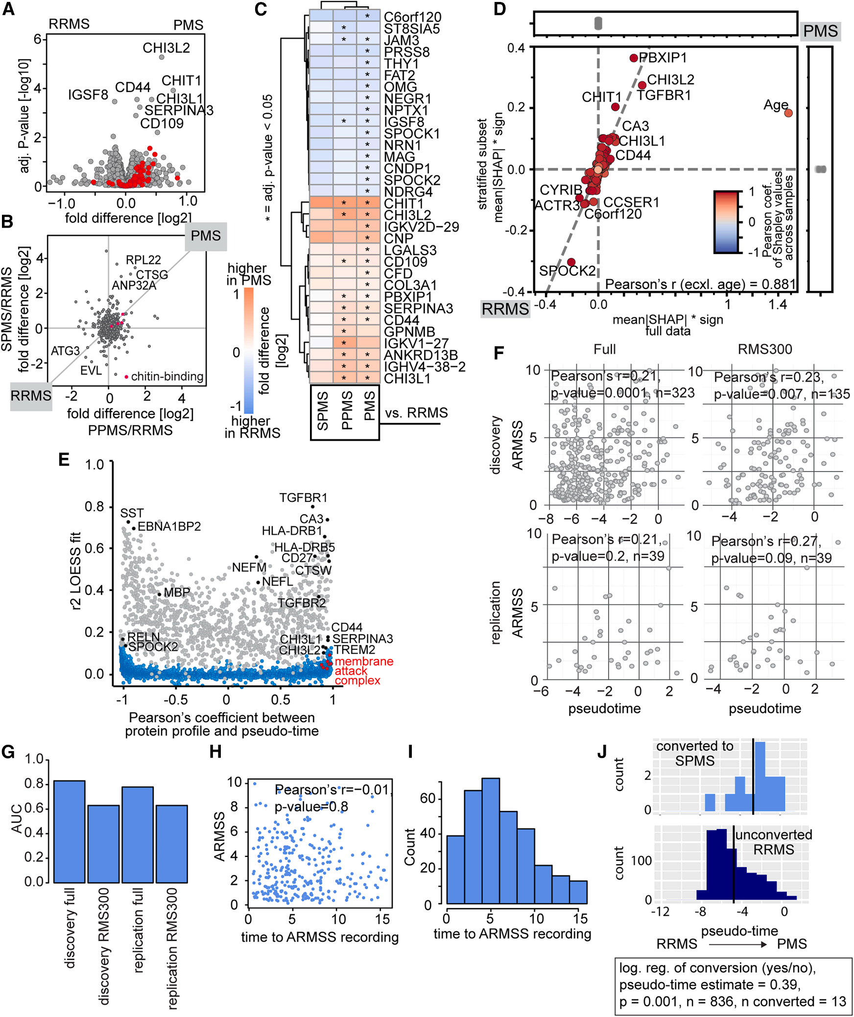通过对复发缓解型多发性硬化症(RRMS)与进展型多发性硬化症(PMS,包括PPMS和SPMS)患者的脑脊液蛋白质组进行对比分析,研究人员发现原发性进展型(PPMS)与继发性进展型(SPMS)患者表现出高度相似的蛋白质组改变,这与它们同属进展型病程的临床特征一致(Fig. 7A-C)。而机器学习鉴别分析揭示,适应性免疫相关标志物更多地指向RRMS,而固有免疫特征(如补体激活)则在PMS中占主导(Fig. 7D-E)。此外,与神经胶质细胞耗竭相关的SERPINA3及转化生长因子-β信号通路成分TGFBR1也与PMS显著相关。