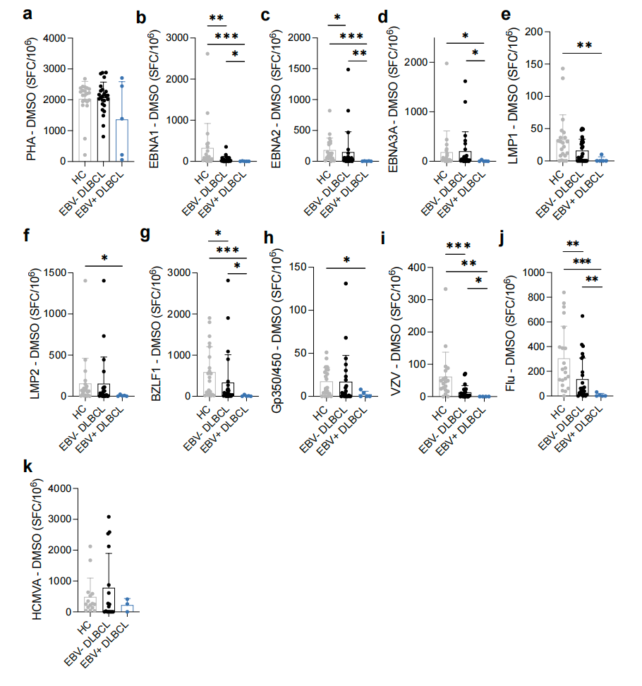 在外周血层面,作者收集了健康供体、EBV阴性DLBCL患者和EBV阳性DLBCL患者的PBMC样本,采用IFN-γ ELISpot 检测T细胞对多种病毒抗原的反应,用于评估机体的系统性抗病毒免疫功能。