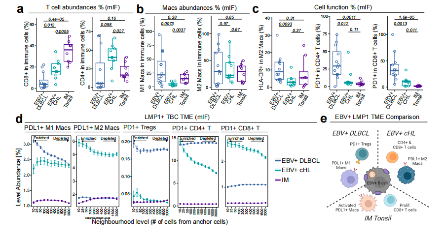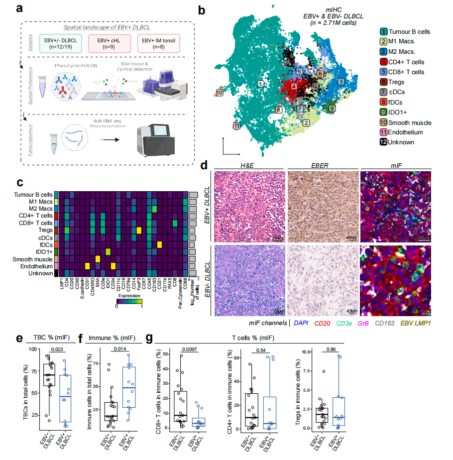 近期,利默里克大学医学院研究团队发表题了为《Loss of systemic anti-viral immunity and LMP1-driven suppressive myeloid tumour niches converge to shape the immunobiology of EBV+ diffuse large B-cell lymphoma》 的研究,通过整合外周抗病毒T细胞功能检测、PhenoCycler Fusion(PCF)空间单细胞蛋白组学(原CODEX)以及体外机制模型,系统解析了EBV⁺DLBCL的免疫生物学特征。研究表明,EBV⁺DLBCL并非仅由单一因素驱动,而是全身抗病毒免疫功能受损与LMP1驱动的局部髓系免疫抑制微环境共同作用的结果。
