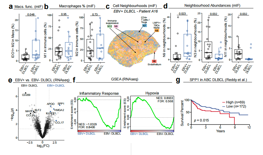 在发现CD8⁺T细胞相对减少后,作者进一步考察了肿瘤中是否存在髓系主导的免疫抑制程序。结果显示,尽管总的M1或M2巨噬细胞数量并未明显升高,但 IDO1⁺ M2-like macrophages 在EBV⁺DLBCL中显著富集,提示其巨噬细胞状态发生了偏向免疫抑制的功能重塑。空间邻域分析进一步发现,这些细胞并非随机分布,而是组织成特定的抑制性细胞邻域。其中,以IDO1⁺巨噬细胞和PD-1⁺Treg富集为特征的抑制性邻域显著扩张,而以CD4⁺和CD8⁺T细胞为主的邻域则明显收缩,说明EBV⁺DLBCL的微环境已经从“效应T细胞主导”转向“髓系抑制主导”。在分子层面,bulk RNA-seq显示EBV⁺DLBCL上调了多种与巨噬细胞免疫调控相关的基因,包括 SPP1、CCL17 等,同时 CCL21 下调,后者通常与T细胞募集和滞留有关。此外,基因集富集分析提示EBV⁺肿瘤富集缺氧相关通路,而缺氧本身已知与SPP1表达升高有关。进一步分析显示,高SPP1表达与较差预后相关。