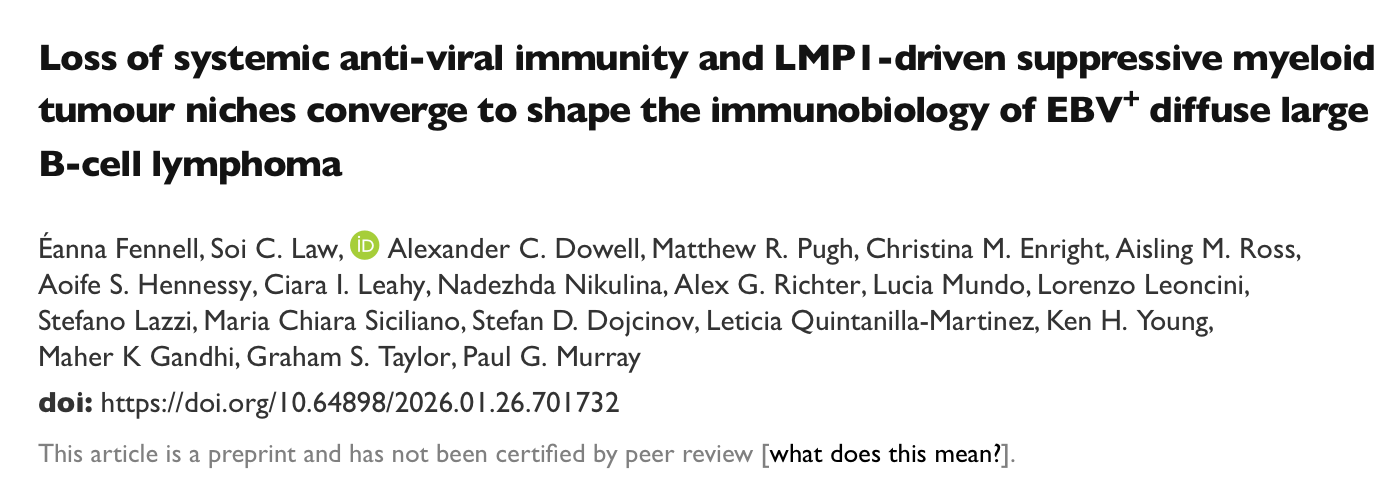 EBV⁺弥漫大B细胞淋巴瘤(EBV⁺DLBCL)是一类侵袭性强、预后较差的B细胞恶性肿瘤。传统观点认为,其发生主要与老年相关的免疫衰老有关,但该疾病实际上可见于多个年龄段,提示其致病机制并不能仅用“免疫衰老”来解释。目前,对于EBV⁺DLBCL患者是否存在明确的全身抗病毒免疫缺陷、以及肿瘤微环境如何在空间层面塑造局部免疫抑制状态,仍缺乏系统认识。