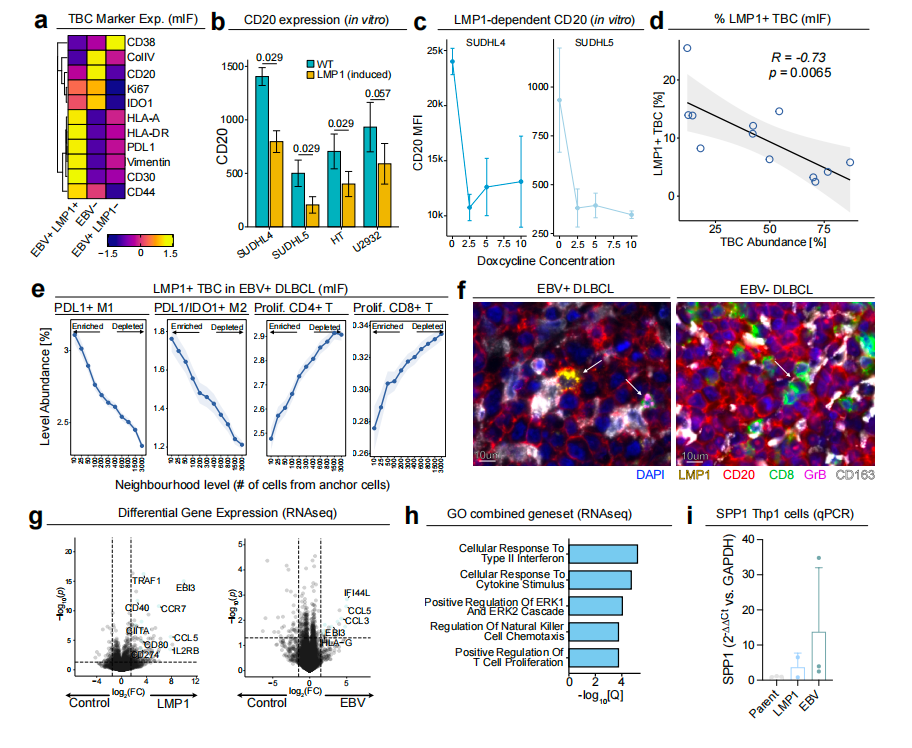 在组织层面,作者纳入了EBV阳性和阴性DLBCL、EBV阳性经典霍奇金淋巴瘤(cHL)以及EBV相关传染性单核细胞增多症(IM)的FFPE样本,利用PhenoCycler Fusion平台开展空间单细胞蛋白组学,并结合bulk RNA-seq与体外LMP1诱导模型,进一步解析肿瘤微环境的构成及其潜在形成机制。
