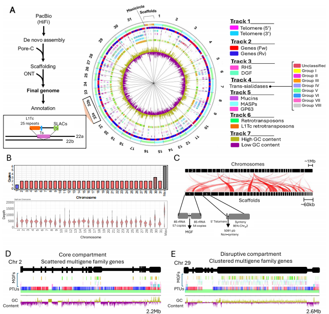 麦吉尔大学寄生虫学研究所团队发布克氏锥虫Sylvio X10株端粒到端粒完整基因组,31条染色体含2934个多基因家族(MGF)成员,占基因总数21%。TMT定量蛋白组显示转唾液酸酶(TS)、黏蛋白、MASP等毒力因子在感染型锥鞭毛体(CT)显著上调,且表达位点分散于各染色体。