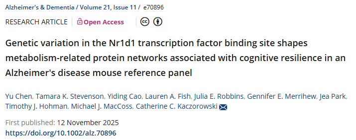 7. (Alzheimer's & Dementia,IF:13.0)Nr1d1转录因子结合位点的遗传变异塑造了与阿尔茨海默病小鼠参考面板中认知弹性相关的代谢相关蛋白网络