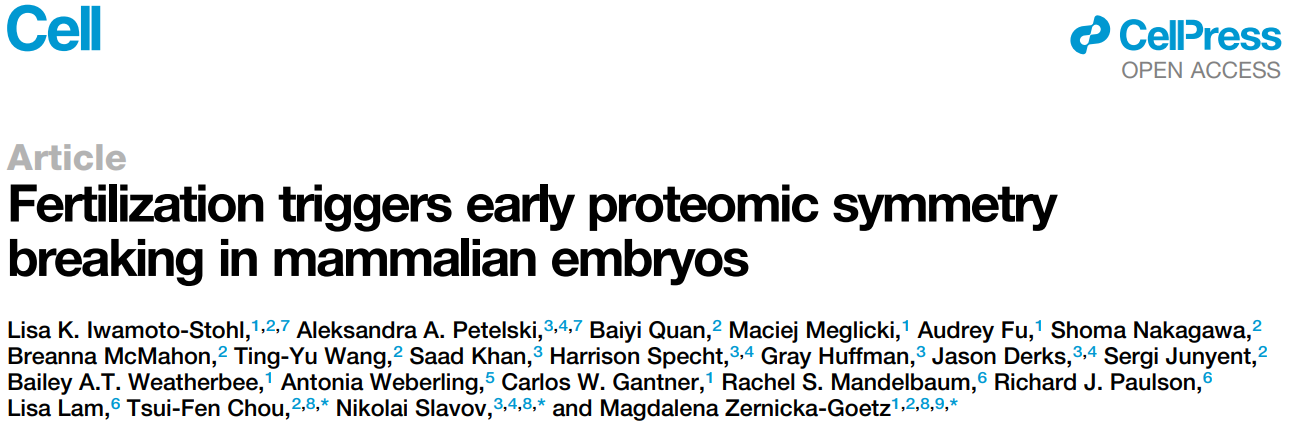1. (CELL, IF:45.5) 受精触发哺乳动物胚胎早期的蛋白质组对称性破坏
