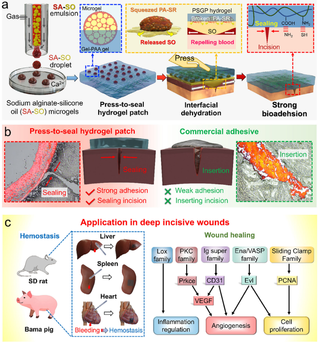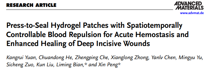 中山大学团队与华南理工大学团队合作,开发“PSGP”按压式水凝胶贴片,实现深部切口快速止血与加速愈合。