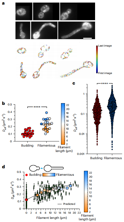 法国蔚蓝海岸大学Robert Arkowitz团队联合德、美、英多中心在《Nature Microbiology》发表研究,首次揭示白念珠菌酵母-菌丝形态转换的“物理开关”。作者利用40 nm 荧光纳米颗粒追踪和原位冷冻电镜,发现菌丝形成时细胞质“拥挤度”随丝长度增加而显著下降,导致中尺度扩散系数提升2倍。
