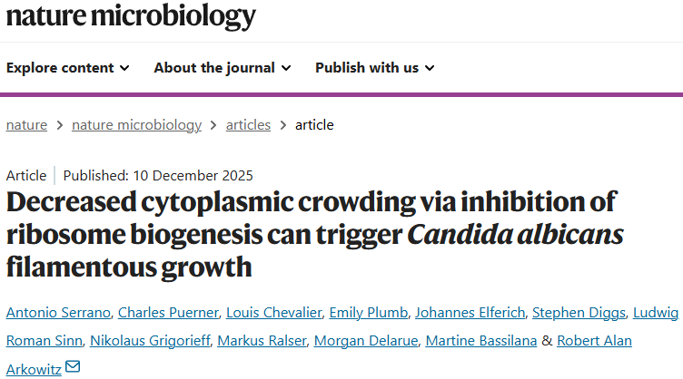 05 (NAT MICROBIOL) 通过抑制核糖体生物发生减少细胞质拥挤可触发白色念珠菌丝状生长