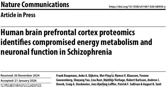 8. (NAT COMMUN,IF:14.7) 人类大脑前额叶皮层蛋白质组学揭示精神分裂症中受损的能量代谢和神经元功能