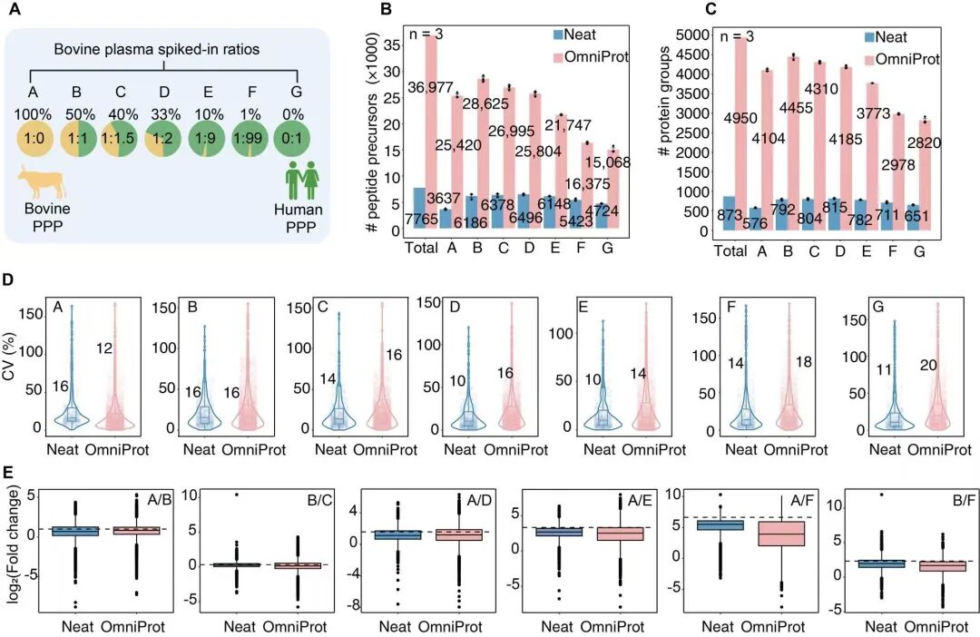 此外,在人-牛混合样本的交叉物种定量准确性评估实验中,OmniProt在检测蛋白数量优于传统直接酶解方法,定量准确性方面与Neat条件下基本一致。三种条件下的生物学重复之间的变异系数中位数低于20%,证实了该流程的高准确性与高重复性。
