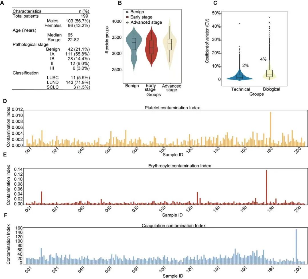 为验证OmniProt和白泽 (Baize) 的实际应用价值,研究团队分析了199例肺结节患者(含良性、早期恶性及6例晚期对照)的血浆样本。所有样本采用OmniProt流程处理后进行Astral质谱仪的nDIA方法采集数据,共鉴定出约4413个蛋白质,实验重复性高。通过白泽 (Baize) 检测,研究团队成功识别出5例存在明显污染的样本,并将其从后续分析中剔除,确保了数据的可靠性。