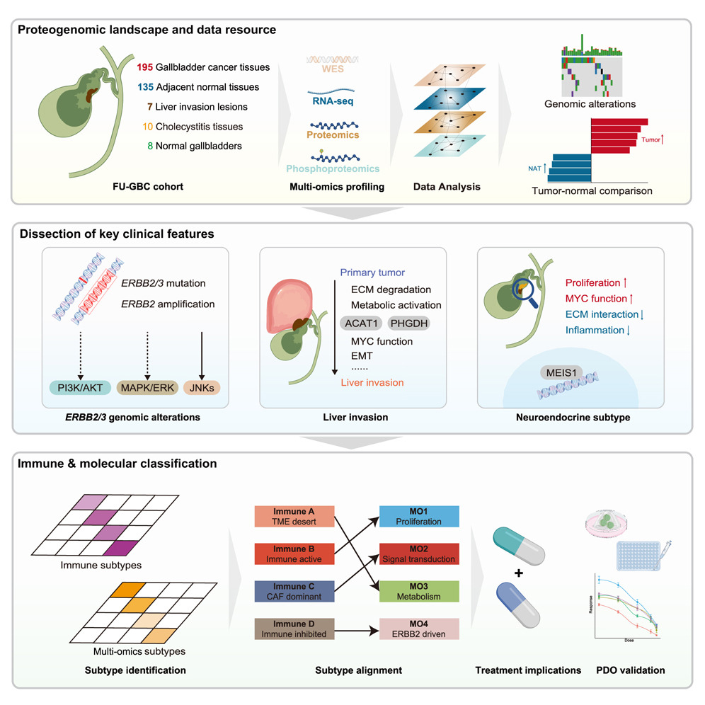 该研究建立了全球目前规模最大的胆囊癌(GBC)多组学图谱(FU-GBC队列),通过对195名患者的肿瘤组织进行蛋白质组、磷酸化蛋白质组、转录组及外显子组的整合分析,深度揭示了胆囊癌独特的分子特征。研究不仅颠覆了传统认知,发现ErbB2扩增在胆囊癌中表现为抑制经典PI3K/AKT通路、转而激活MYC和细胞周期的“非典型信号传导”,还锁定了ACAT1和PHGDH作为驱动肝侵袭的关键代谢因子,并根据多组学特征将胆囊癌精准划分为四种亚型(MO1-MO4),同时首次阐明了MEIS1在诱导罕见神经内分泌癌表型转化中的核心作用,为胆囊癌的临床精准诊疗和新药研发提供了极其宝贵的科学资源。