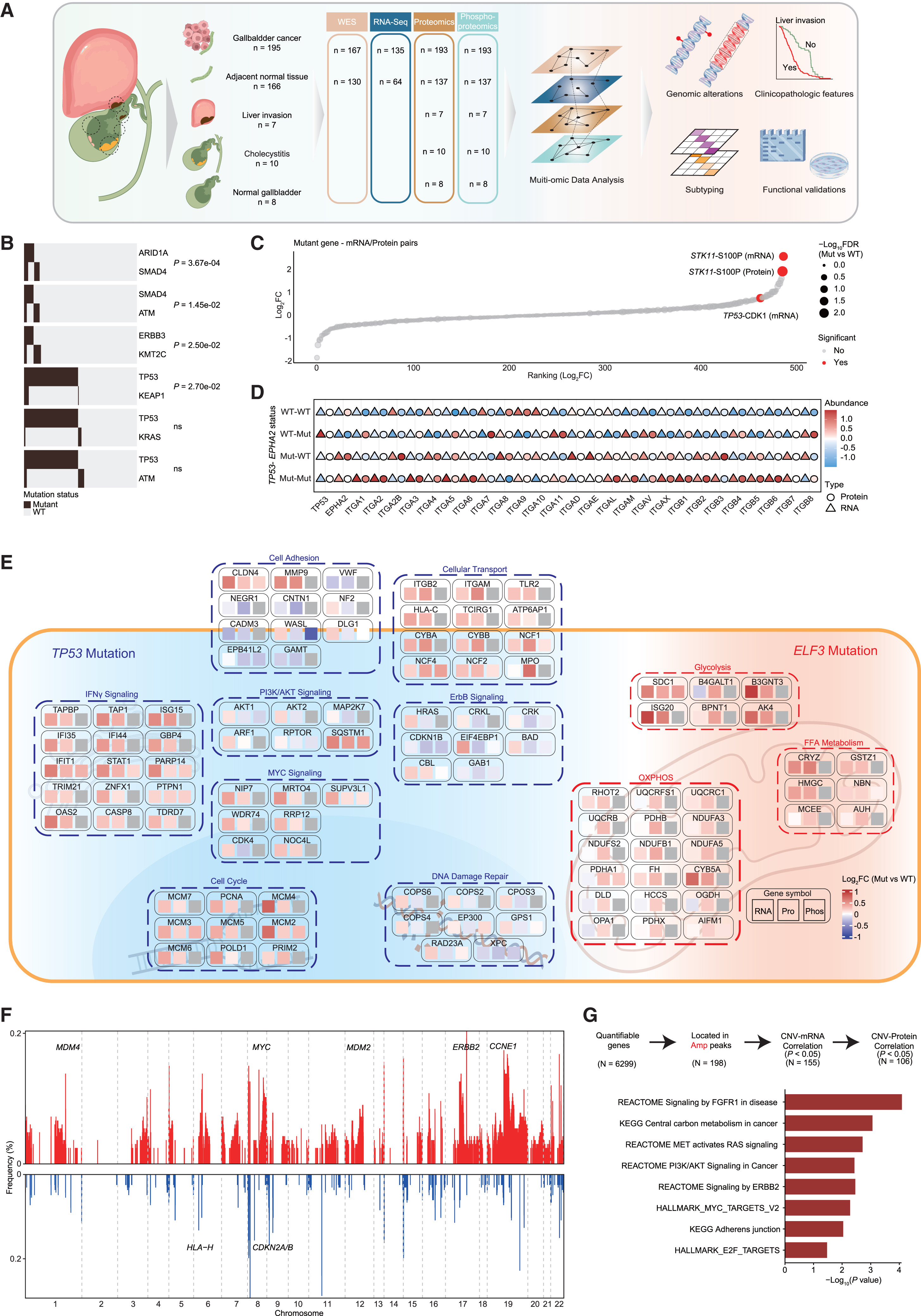 在此基础上,作者先给出GBC的高频驱动突变谱(TP53 47.9%)并展示显著的共突变关系(如SMAD4-ARID1A、SMAD4-ATM等)(Fig.1B),随后系统评估突变对mRNA/蛋白丰度的cis/trans影响(Fig.1C)并指出TP53突变与EPHA2及整合素家族上调相关、EPHA2突变也可上调整合素,提示可能存在“TP53→EPHA2→整合素”联动轴(Fig.1D);通路层面进一步总结TP53突变激活细胞周期/DNA损伤应答等程序、ELF3突变更偏向代谢重编程等(Fig.1E);基因组结构变异方面,作者描绘了GBC的广泛CNV图谱(如1q/8q/12p/17q/19q扩增涉及MDM2/4、MYC、ERBB2、CCNE1等,6p/8p/9p/15p缺失涉及HLA/CDKN2A/B等)(Fig.1F),并进一步从扩增峰中筛出同时在mRNA与蛋白层面呈正相关的顺式效应基因,显示这些CNV事件富集于FGFR1、RAS、ERBB2与MYC靶基因等致癌通路,强调其潜在驱动作用(Fig.1G)。