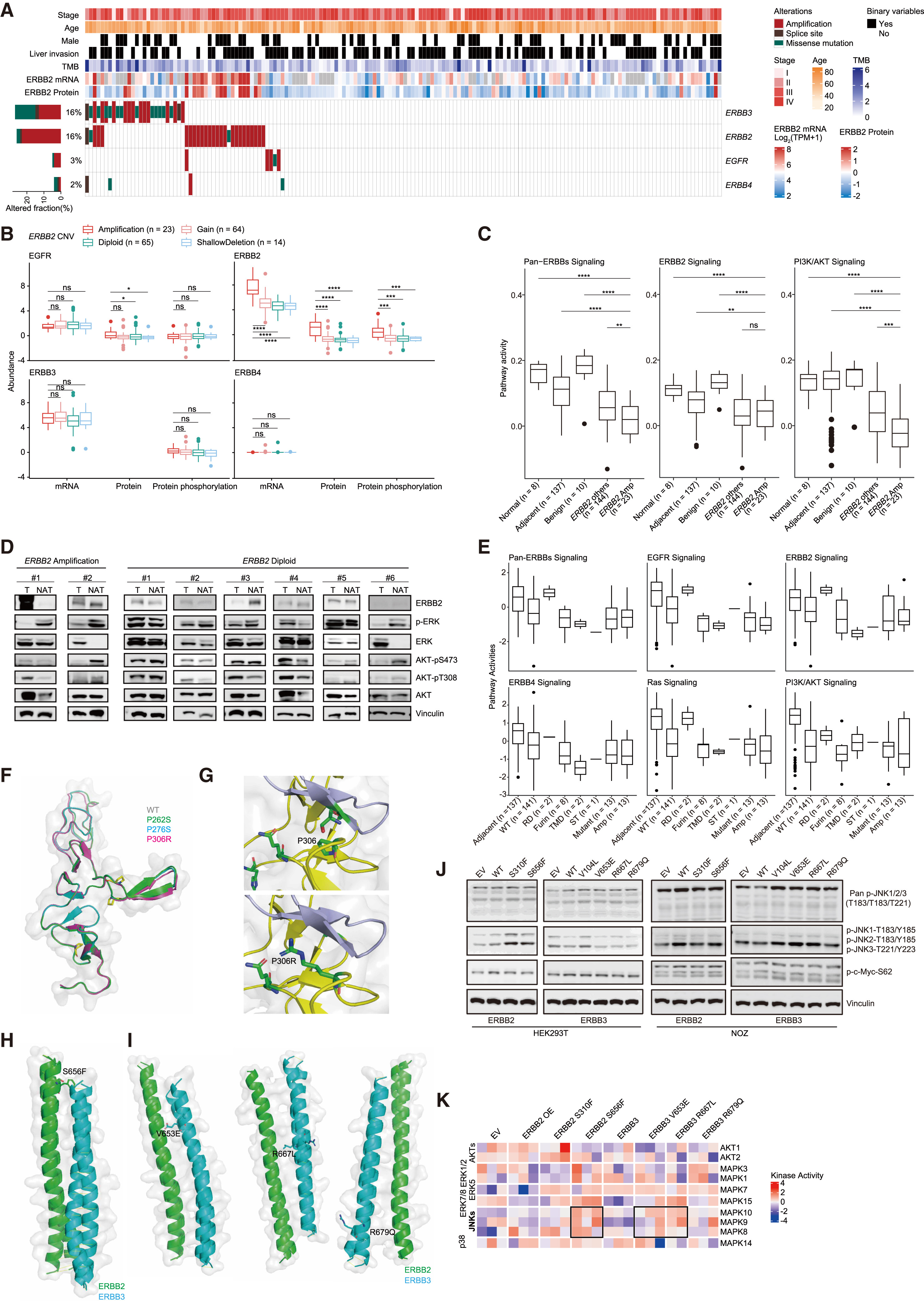 在突变层面,蛋白组提示ErbB3受体结构域(I/III)突变更可能增强下游ErbB信号活性(Fig.2E);结构建模显示ErbB3 P306R(domain II)可通过引入氢键供体、缩短与ErbB2II域结合区距离来增强异源二聚体稳定性/亲和力(Fig.2F-G);对跨膜结构域(TMD)突变,预测结果表明ErbB2 S656F及部分ErbB3 TMD突变(如V653E、R667L)会缩短二聚体距离并改变极性片段(Fig.2H-I)。功能验证显示这些TMD突变体会提高MYC活性并更偏向JNK信号(p-JNK升高),KSEA也显示突变细胞系JNK1/2/3活性高于AKT/ERK(Fig.2J-K)。揭示了ErbB2/ErbB3改变可通过“二聚体增强+信号偏好转向”产生非经典致癌效应并带来治疗启示。