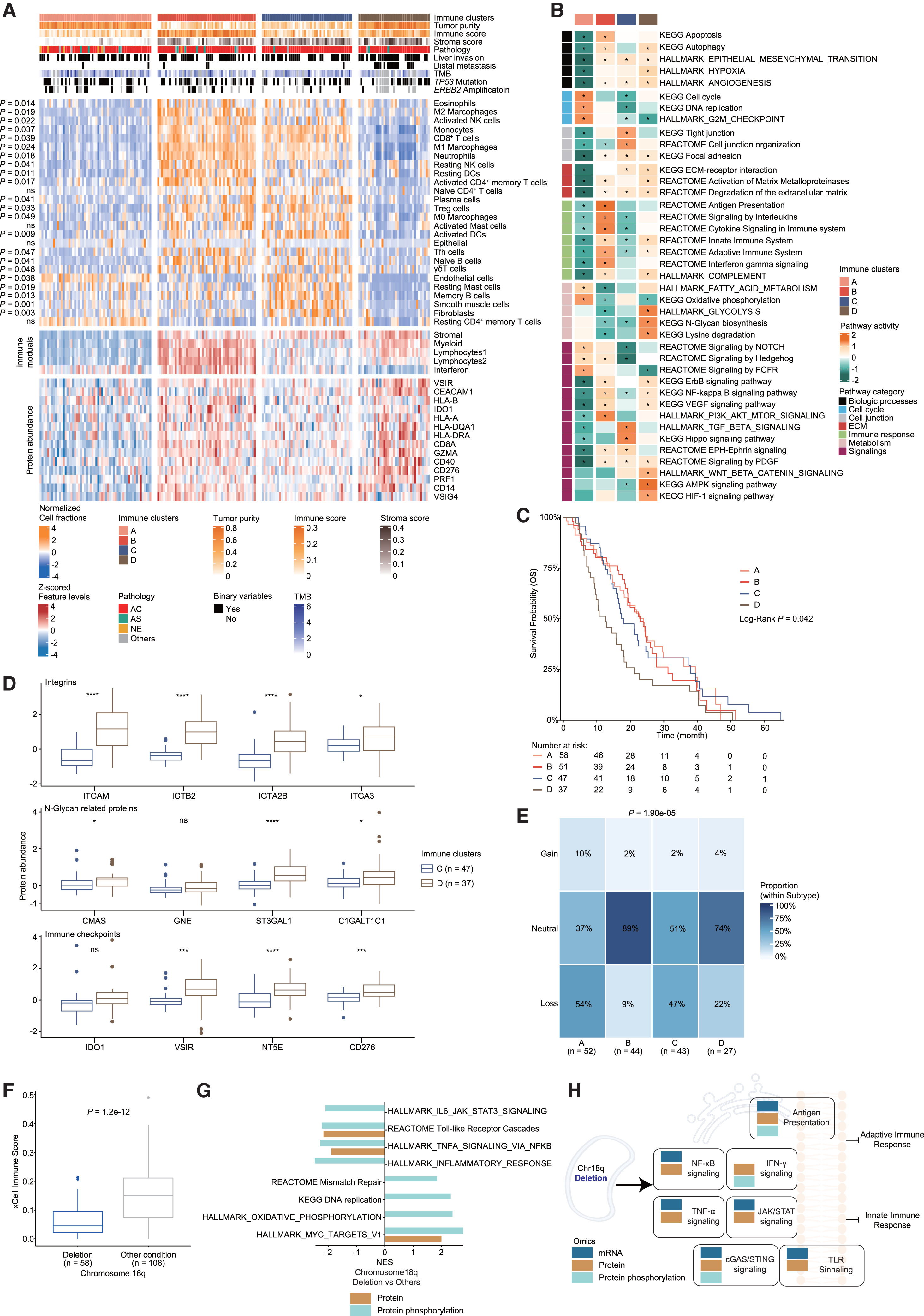 在基因组关联上,各亚型TMB无显著差异但染色体不稳定性在A/C/D高于B,并且一个关键事件是chr18q缺失在B型更少见(Fig.4E),chr18q缺失与免疫评分下降显著相关(主要由CD8+T、NK、M1巨噬减少驱动,Fig.4F),同时伴随增殖与MYC活性增强及多条免疫通路(如IL-6、TLR、TNFα)下调(Fig.4G),多组学证据进一步提示其可通过多机制共同破坏先天与适应性免疫应答(Fig.4H),因此chr18q缺失可能成为反映/预测GBC抗肿瘤免疫活性的潜在生物标志物。