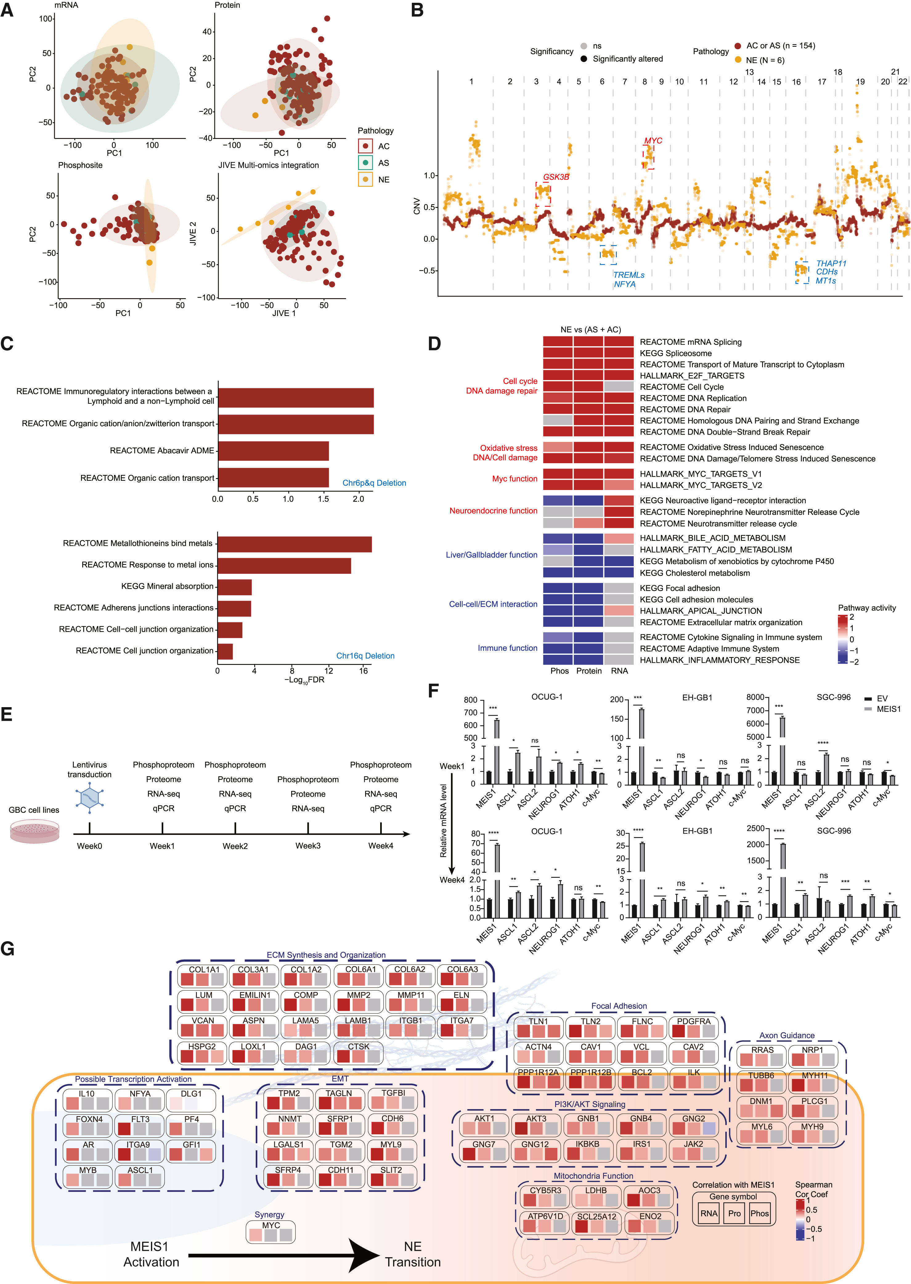 机制上,作者通过转录因子活性推断与多组学相关性分析提出MEIS1 是 NE-GBC 的关键调控枢纽,可能与 MYC 协同维持 NE 表型(Fig.6E–G),并用功能实验验证:在 AC-GBC 细胞中稳定过表达 MEIS1 后,NE 标记 CHGB 及多种 NE 相关转录因子(如 ASCL1/2、NEUROG1、ATOH1)随时间显著上调,提示 MEIS1 具备推动 AC 向 NE-样状态“重编程/转分化”的能力(Fig.6E–F),同时与 MEIS1 相关的多组学特征提示其可能驱动 ECM/黏附骨架重塑、PI3K/AKT 激活与轴突导向等过程(Fig.6G)。